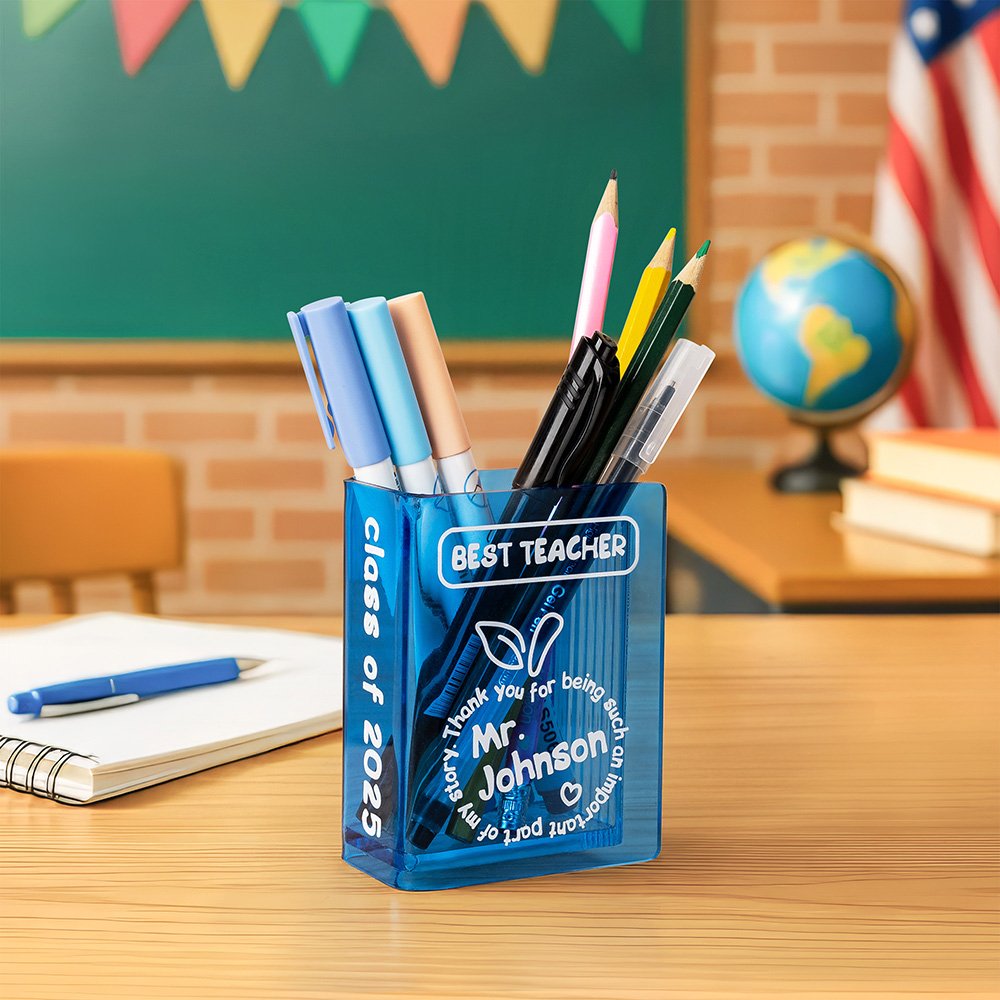 • Stylish Decor: The acrylic pen holder adopt a book shape style, matching apple pattern and engraving name on front, which can be a perfect gift for teacher. Available in blue,green,orange,grey color, this pencil holder for desk is your best choice in desk accessories.