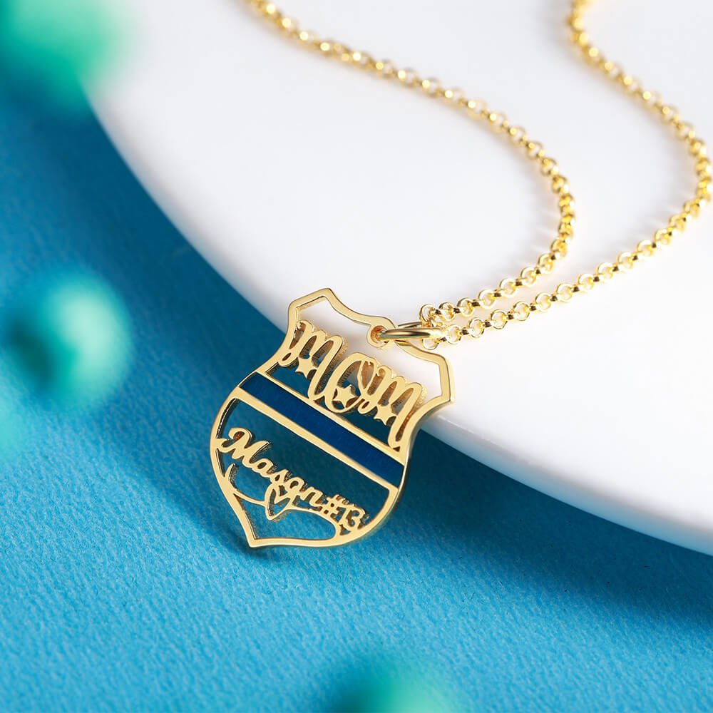 β’ Pay tribute to the police with this unique police badge necklace by Callie. In terms of design, the blue stripes can highlight the solemnity and guardianship of the police. The MOM word at the top of the badge is a fixed display and cannot be modified, and the policeman's name can be customized at the bottom of the badge. This one is a great gift for a police mom to show off her proud son. Every mom would be proud to have a police son.