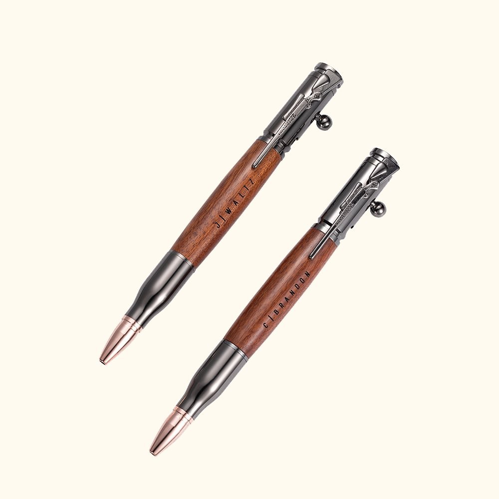 •Offered by Callie Gifts with the rifle and bullet design, this pen is just made for the gun aficionado. High quality mahogany wood barrel with sleek bullet pen opening like a bolt action rifle, and a .30-06 caliber bullet tip, the pen is perfect for an enthusiast of hunting and history buffs.These bolt action pens open like a bolt action rifle. More than that, it can be customized with names or messages, anything you want to show on the pen.