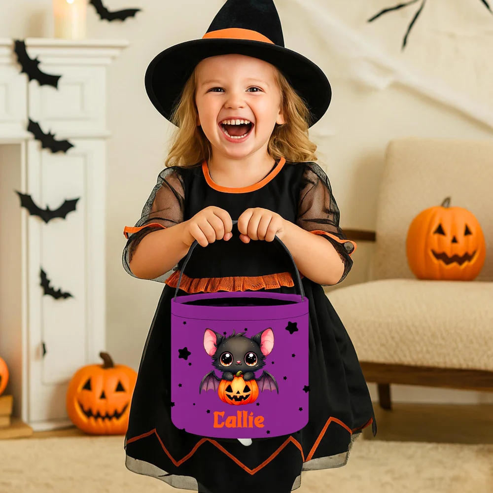 Trick-or-treating gets better with a bucket that’s uniquely theirs! This personalized multicolor cute bat-star pattern candy bucket features vibrant bat and star designs, and you can add your kid’s name to avoid mix-ups. It’s durable, reusable (great for years to come), and roomy enough for all their Halloween loot.