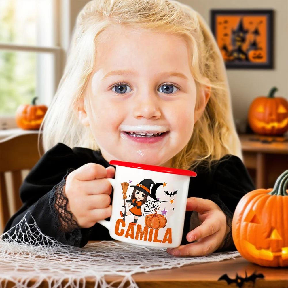 Even infants can join the festive fun with this personalized moon-pumpkin cartoon enamel cup. It’s sized just right for sippy cups or snacks, features a cute moon-and-pumpkin design, and includes the baby’s name. It’s a charming keepsake that parents will treasure long after Halloween.