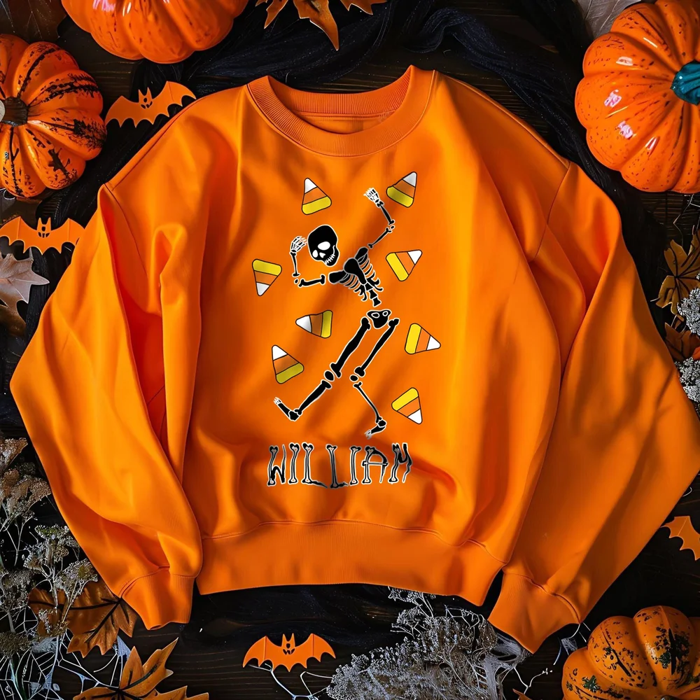 Keep them cozy and on-trend with this personalized skeleton-pumpkin candy sweatshirt. It features a fun mix of skeletons, pumpkins, and candy graphics, and you can add their name or a nickname (like “Spooky [Name]”) for a custom look. It’s great for school, hanging out, or Halloween parties.