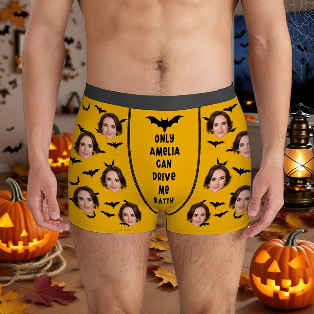 Add a personal (and playful) touch with these personalized “You Drive Me Batty” face photo boxers. Upload a funny or cute photo of you two, add his name, and let the puns shine. They’re comfortable, machine-washable, and perfect for Halloween (or any day!).
