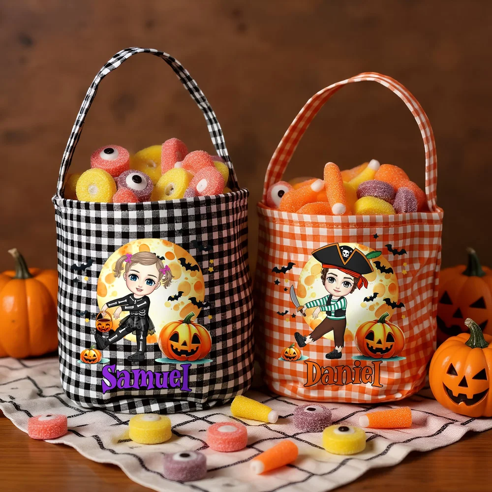 For a whimsical, colorful option, this personalized cute cartoon character pumpkin-moon checkered bag (candy bucket) fits the bill. It has a cheerful checkered pattern paired with cute pumpkin and moon cartoon characters, plus your child’s name for a custom touch. The bucket is roomy enough for handfuls of candy, and the sturdy construction holds up to even the most enthusiastic trick-or-treating. It’s also great for party favors—fill it with small treats for guests!