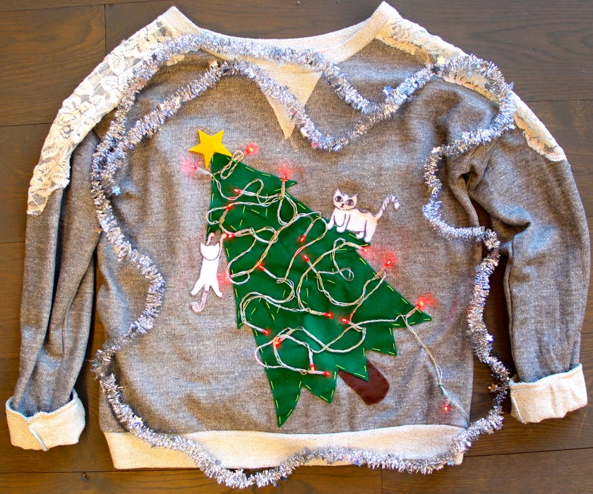 You’ll be the life of the party in this Crazy Cat Tree Christmas Sweater. This one is perfect for anyone who loves cats (and ugly sweaters). You’ll need a green sweater, fake fur, and googly eyes to create this look.