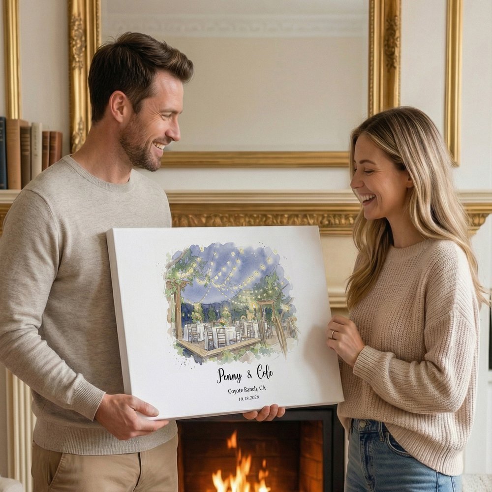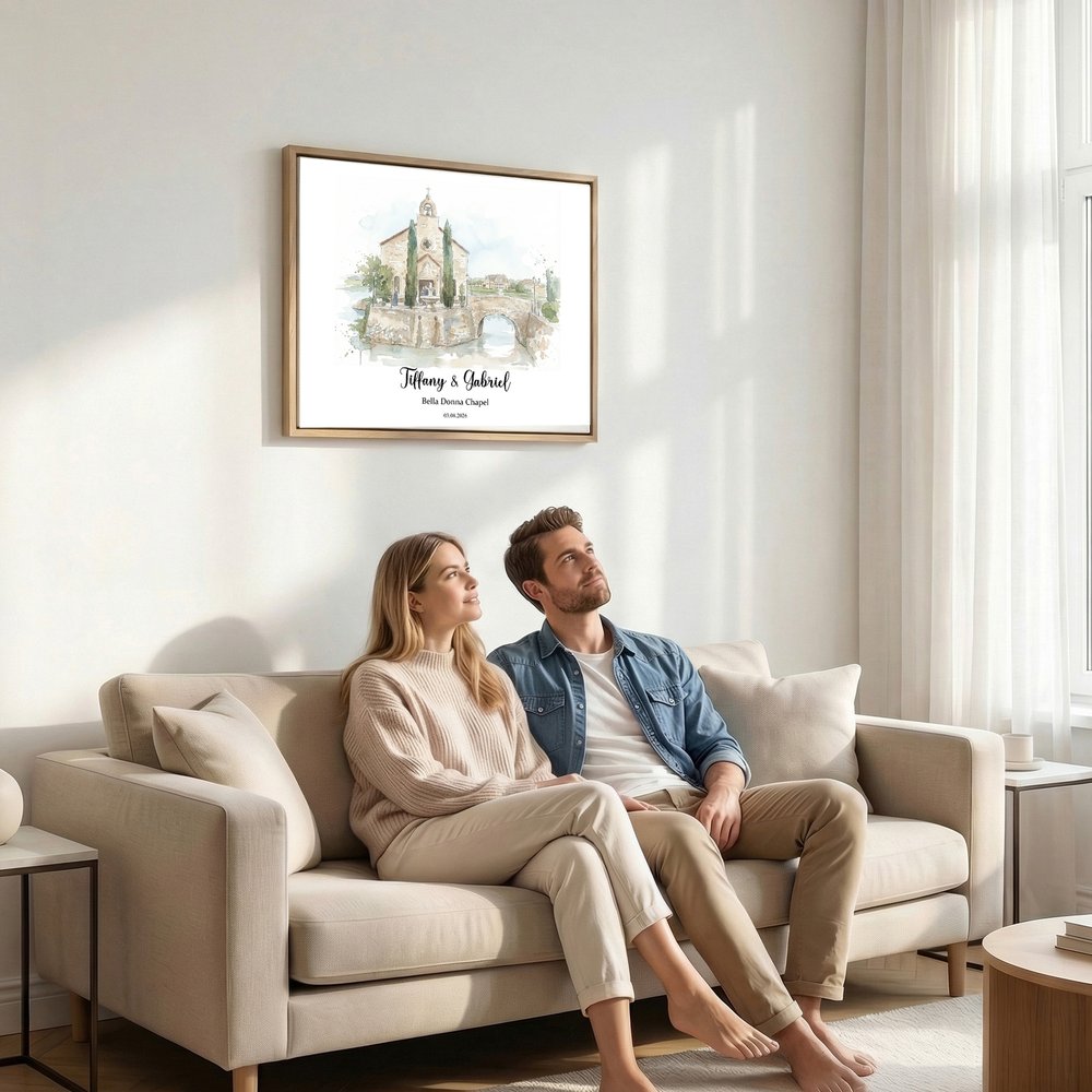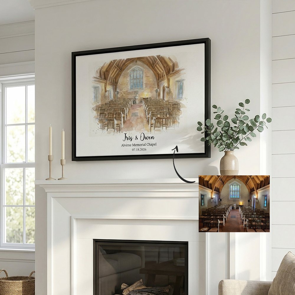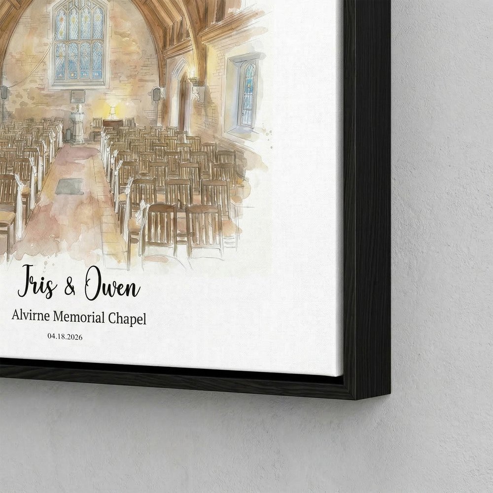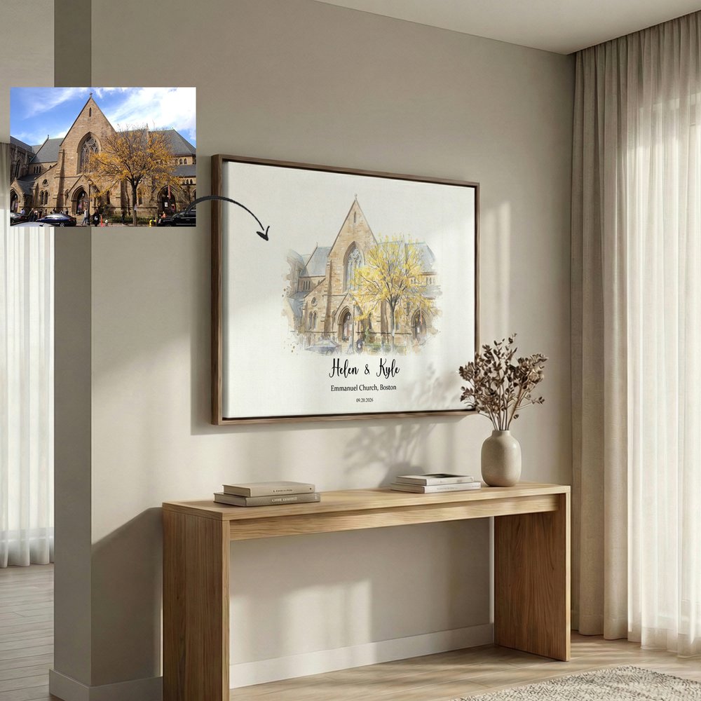 Featuring a watercolor hand-painted style, these canvas prints can be customized with images of wedding architecture, such as churches and gardens, paired with the couple's names, wedding date, and location. The images are beautifully detailed, available in multiple sizes and three-color floating frames, combining artistic appeal with a memorable sentiment.