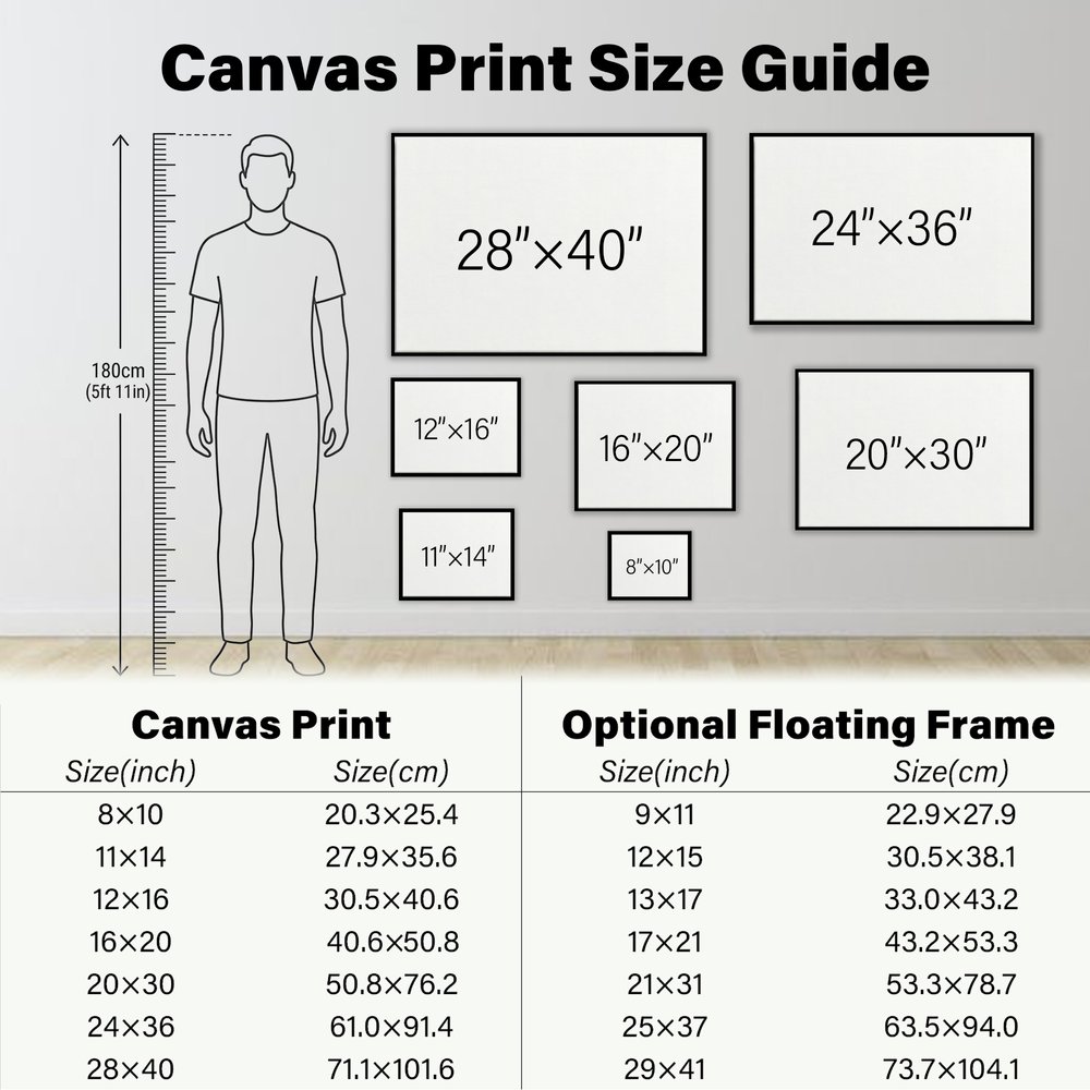 For the best Giclee print quality, please upload high-resolution original photos. Keep important details, such as faces or text, at least 1.5 inches from the edges, as they will wrap around the frame. Please measure your wall space before ordering, since room mockup images are for display purposes only. For split prints or gallery wall displays, we recommend leaving about 2 to 3 inches of space between each piece for a balanced and visually pleasing arrangement.