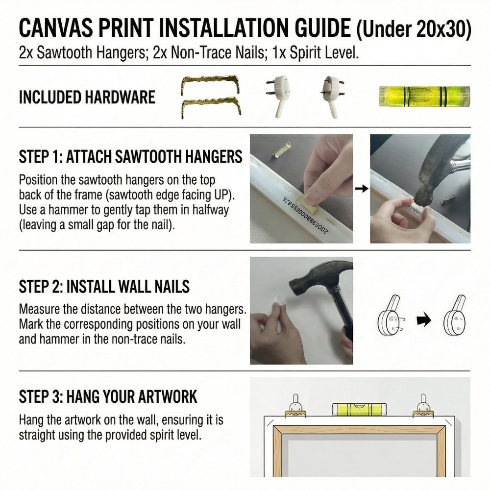 Comes complete with accessories, no complicated tools or frustrating assembly—hang your artwork in minutes and instantly elevate your decor. Our full range of sizes fits every wall perfectly, whether you’re accenting a cozy corner with a small canvas or making a bold statement with a large focal piece.