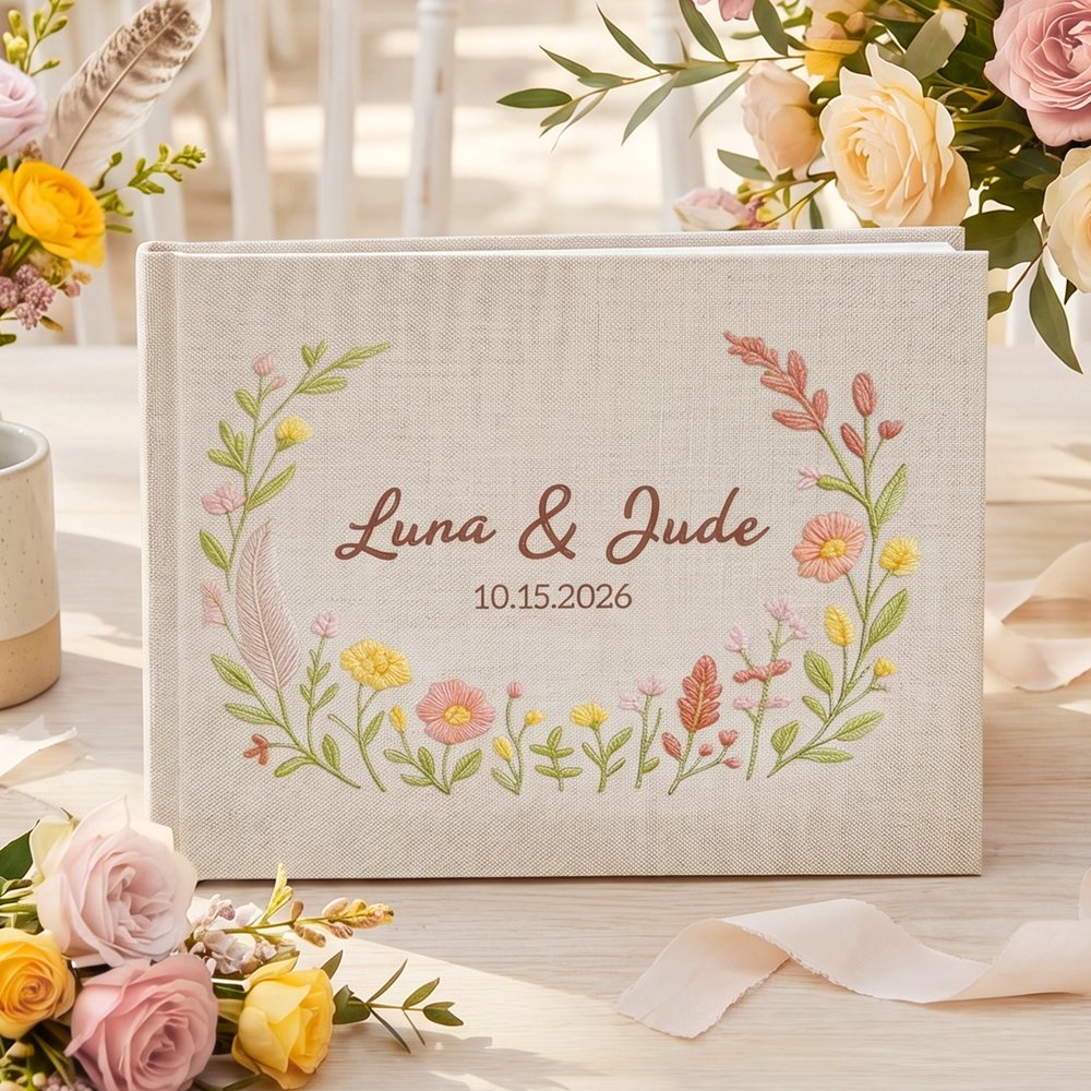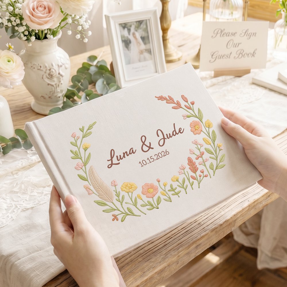 This wedding Guest Book is crafted with a romantic floral wreath and soft green foliage, delivering a fresh, pastoral wedding vibe. Customize the center with the newlywed’s names and wedding date to tailor a one-of-a-kind memento. It perfectly captures romantic wedding moments and serves as a timeless sentimental keepsake for newlyweds.