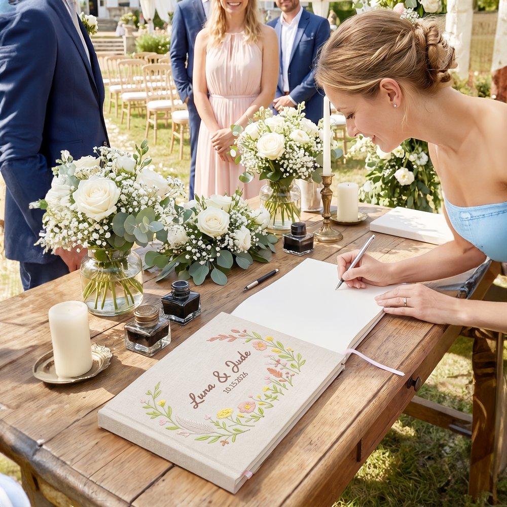 Boasting a premium linen cover, this guest book presents an exquisite textured finish with solid, wear-resistant construction for long-lasting use. Vivid, rich colors and crisp printed details elevate its upscale look. Thick inner pages enable smooth, smudge-free writing with no ink bleeding, ideal for wedding-day use and permanent preservation.