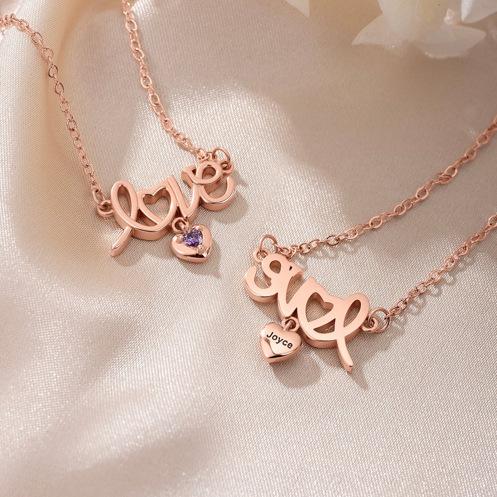 The necklace features a cursive “LOVE” top design, paired with 1–3 small heart pendants (each set with a colored birthstone, engraved with a name on the back). It comes in gold, platinum, or rose gold finishes, and the delicate chain adds a sleek, feminine touch.