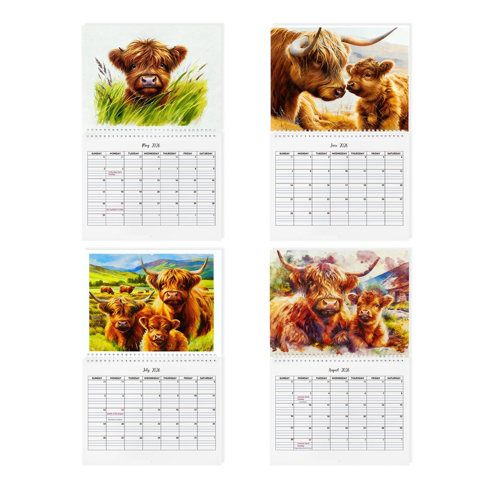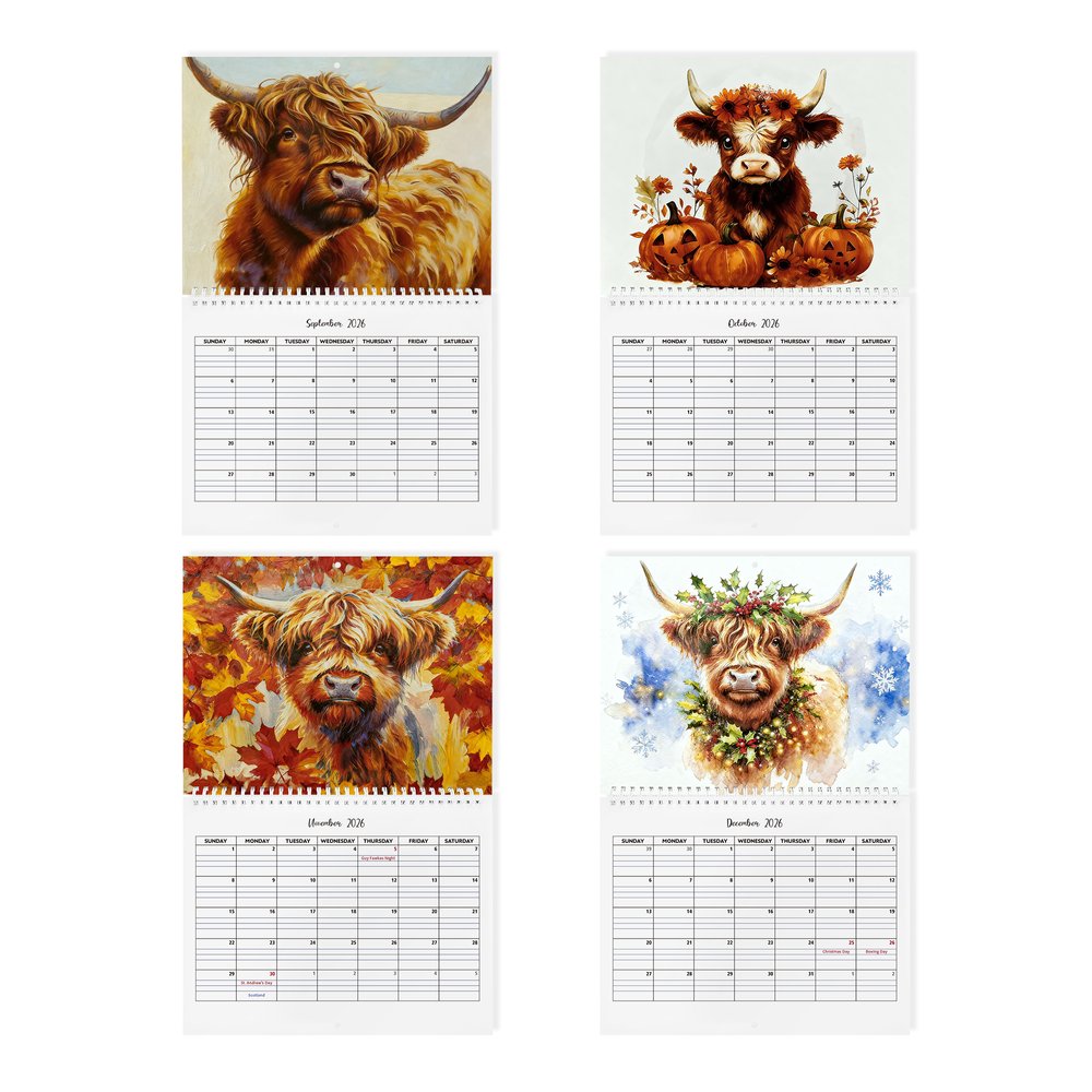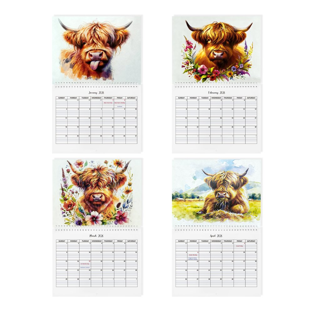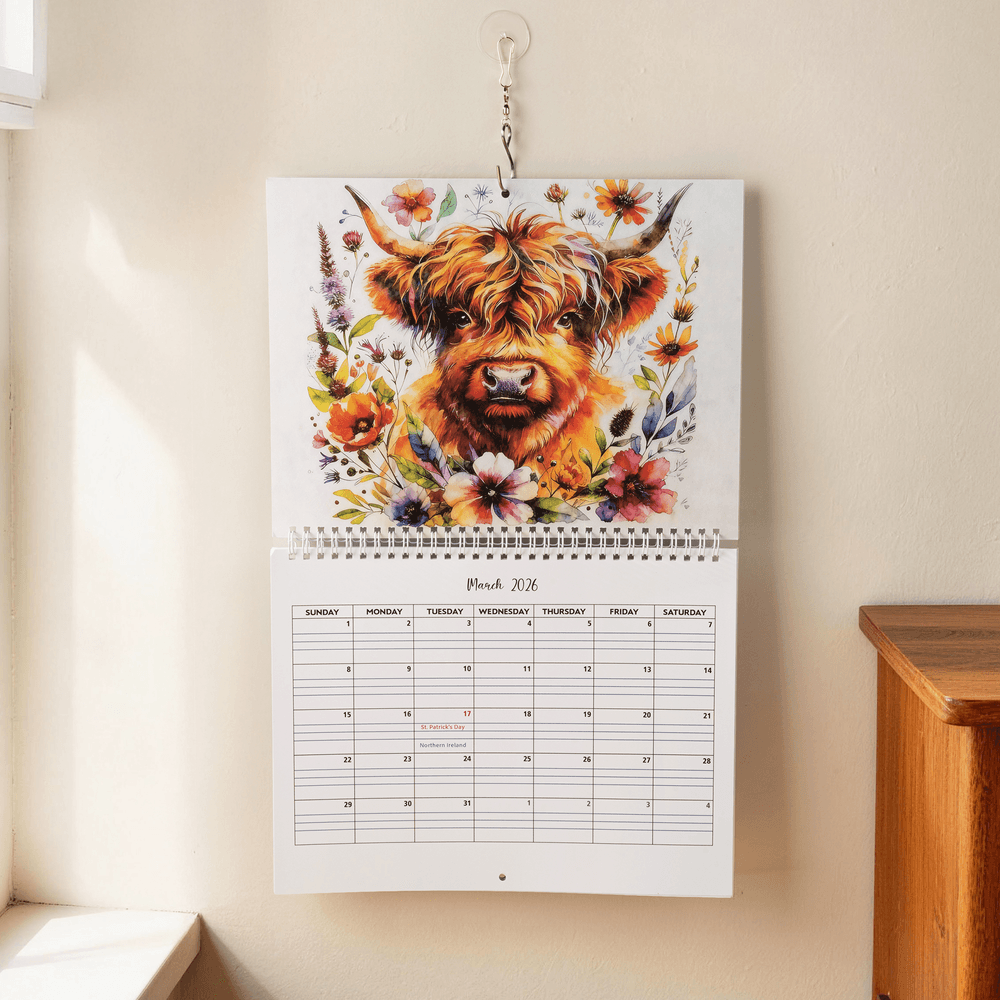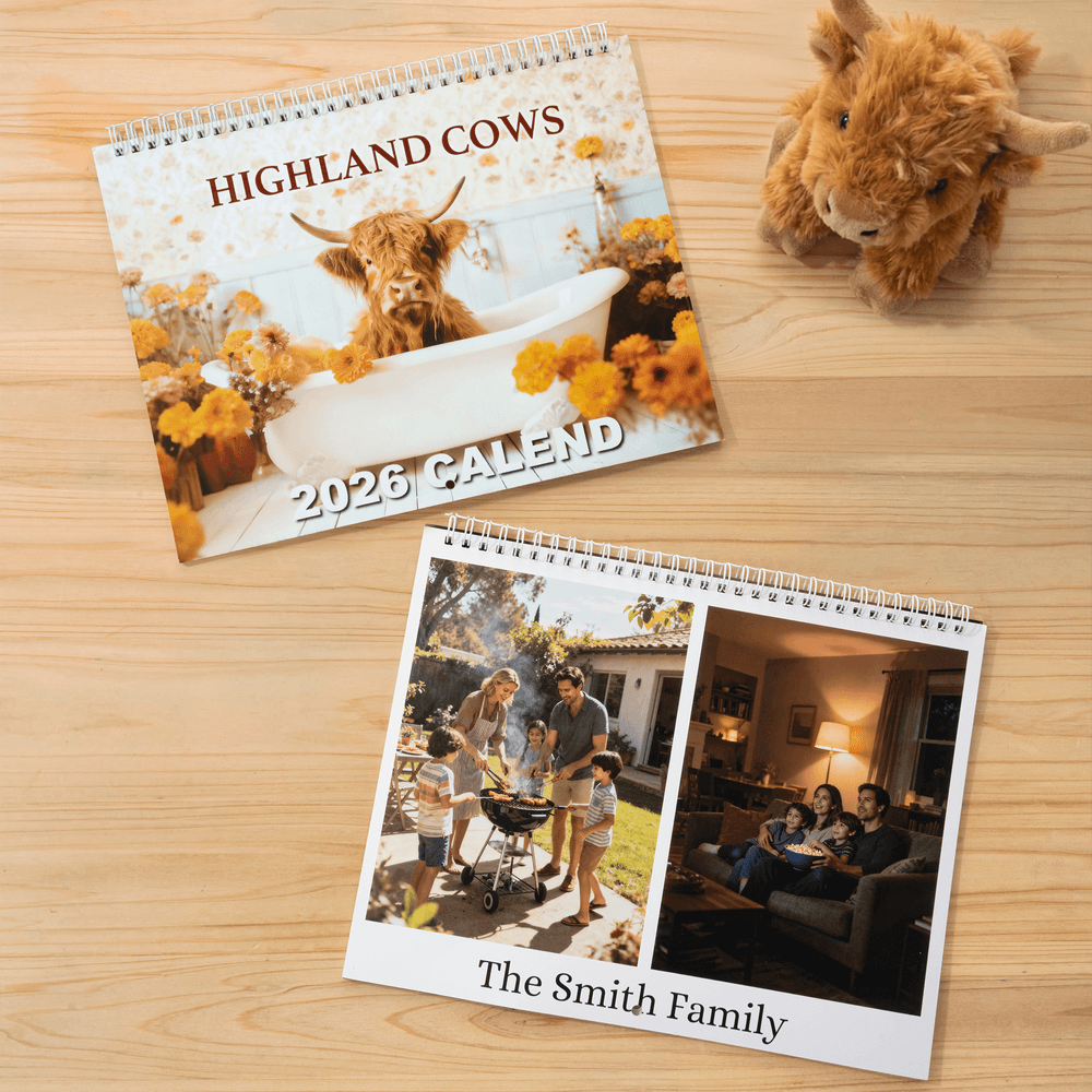 This charming 2026 wall calendar features unique Highland cow illustrations for each month, with two whimsical Highland cow designs to choose from. You can personalize it with custom text、upload photos, and select between UK and US date formats for the inner monthly grids. The rustic floral and Highland cow artwork blends rustic charm with functional planning, turning a simple calendar into a personalized decorative keepsake.