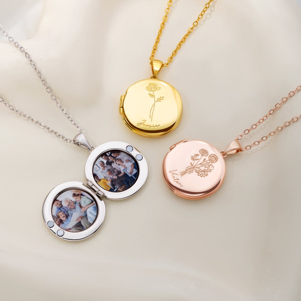 This necklace uses birth flower and photo customization as its core design language, creating a dual medium for emotional expression. The outer layer delicately presents the twelve birth flower symbols, paired with the wearer's name, giving it a personalized touch; the inner layer features family photos, silhouettes of close friends, or photos of loved ones' smiles, making it not only special but also imbued with profound emotional value.
