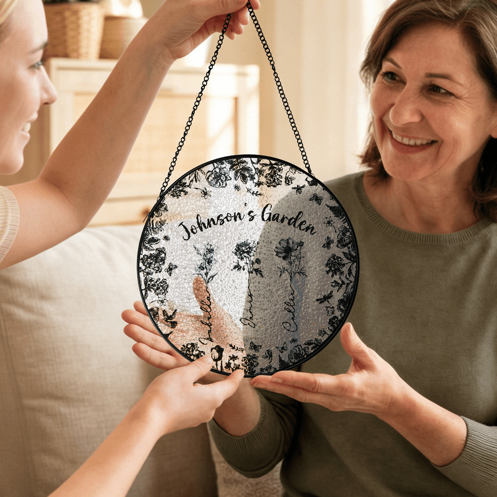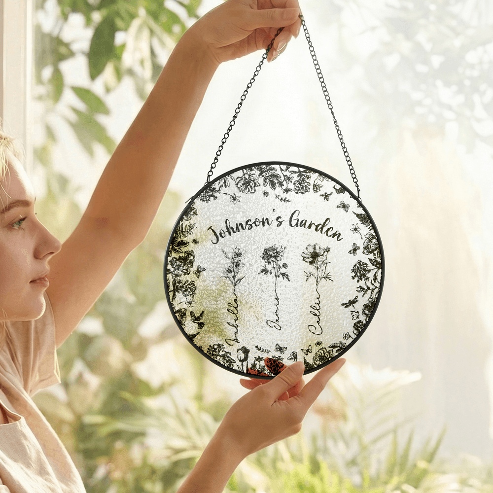 Designed as a meaningful Mother’s Day gift, this custom glass suncatcher expresses gratitude and love with lasting elegance. Personalized names and birth flowers celebrate a mother or grandmother’s unique “garden” of loved ones. More than a decorative item, it becomes a treasured keepsake that honors family bonds. Each sunrise adds renewed warmth to this thoughtful tribute, personalized to reflect her family's story.