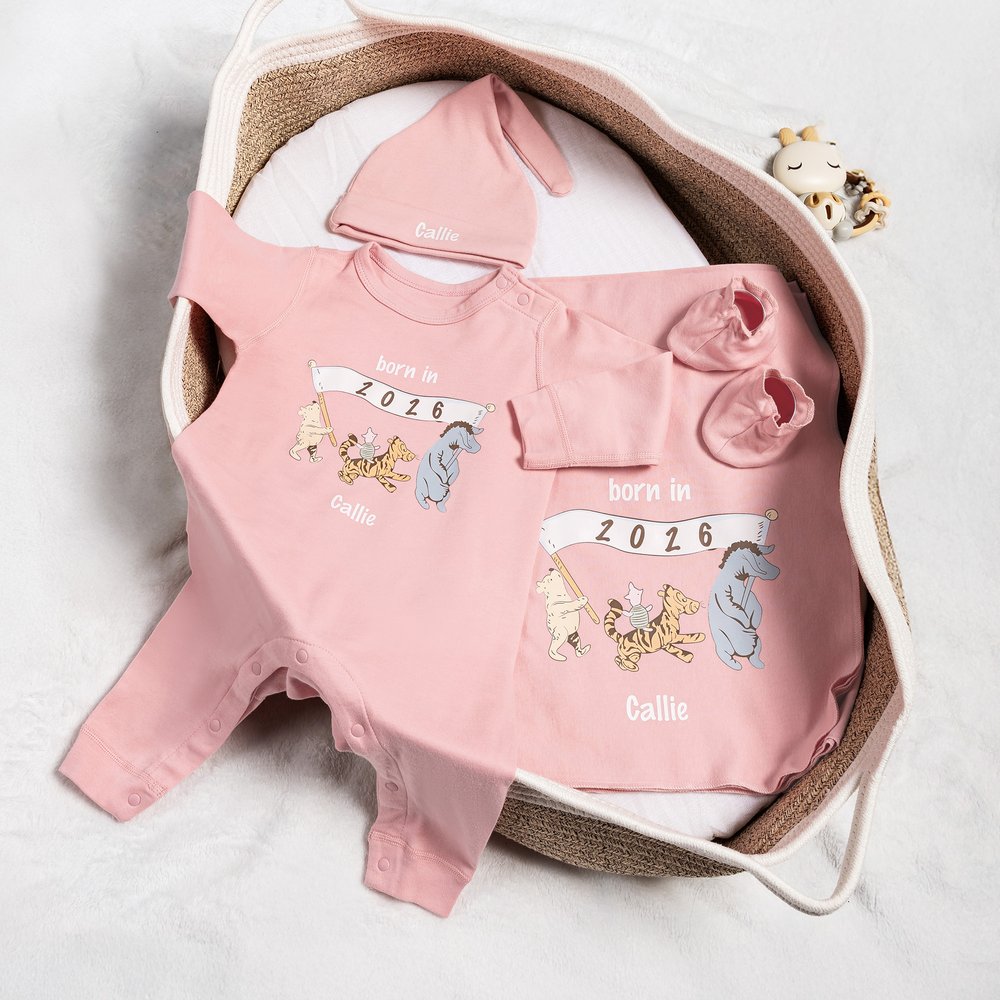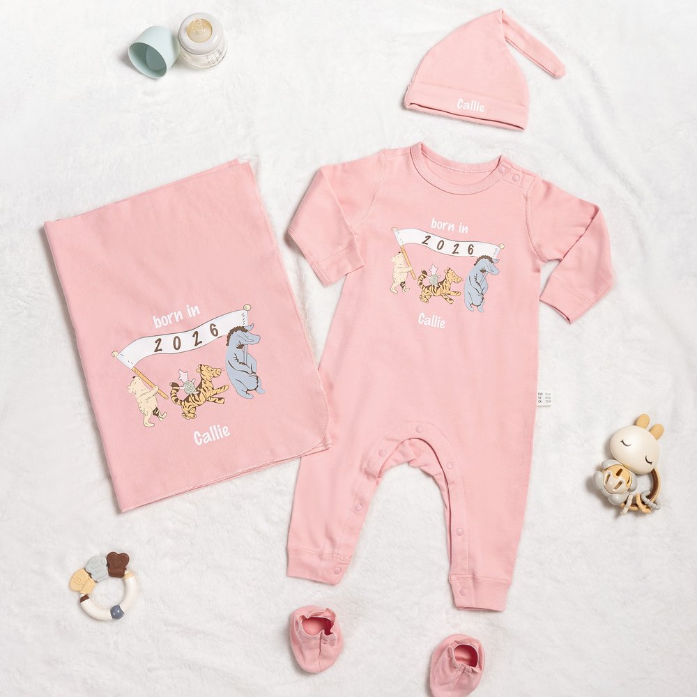 This adorable baby set features the beloved classic Winnie the Pooh, created by the renowned author A. A. Milne and has captured the hearts of generations. The design incorporates playful shades of pink, blue, and white, exuding a strong sense of childhood joy and warmth. It’s perfect for both baby boys and girls, allowing every little angel to feel the love and blessings from their family.