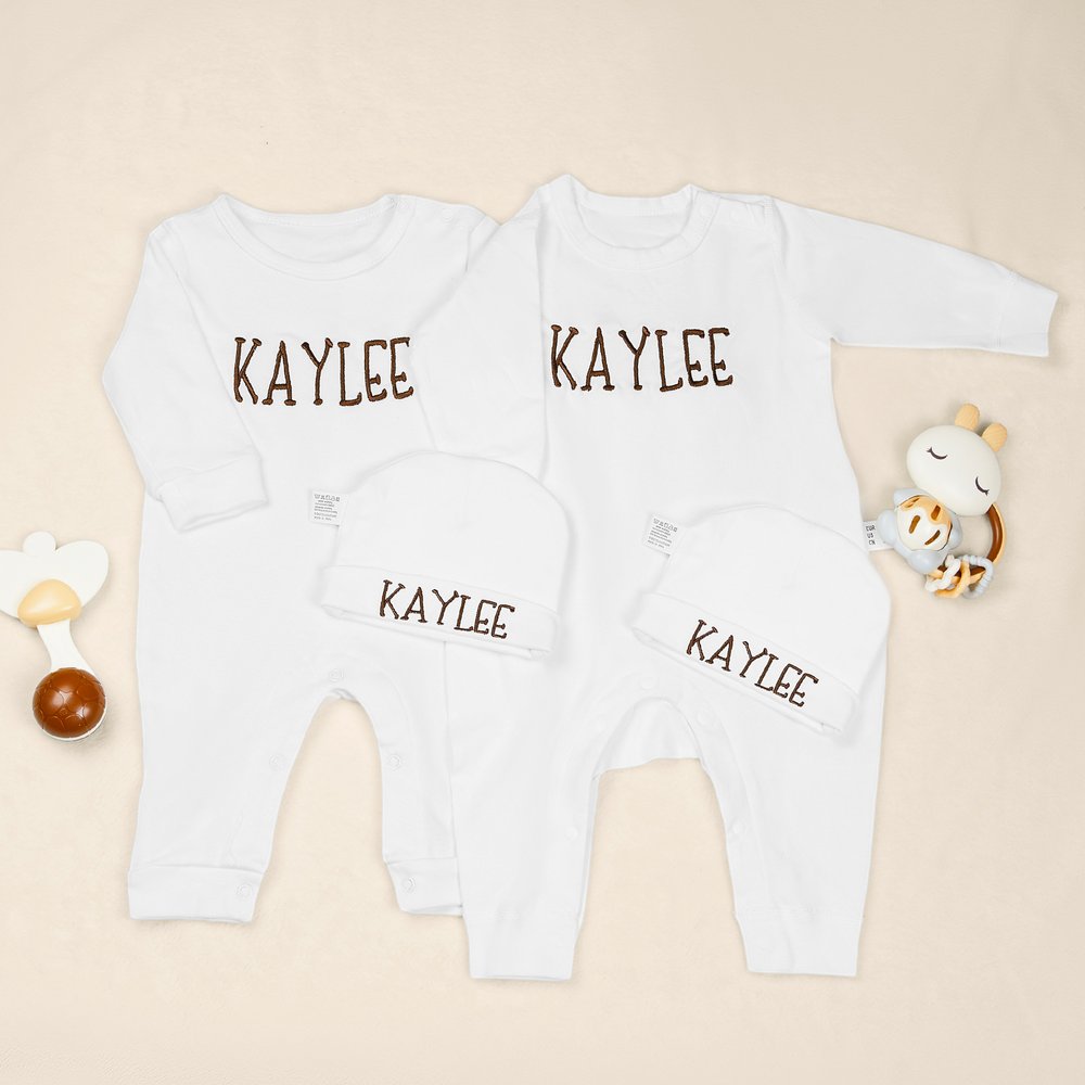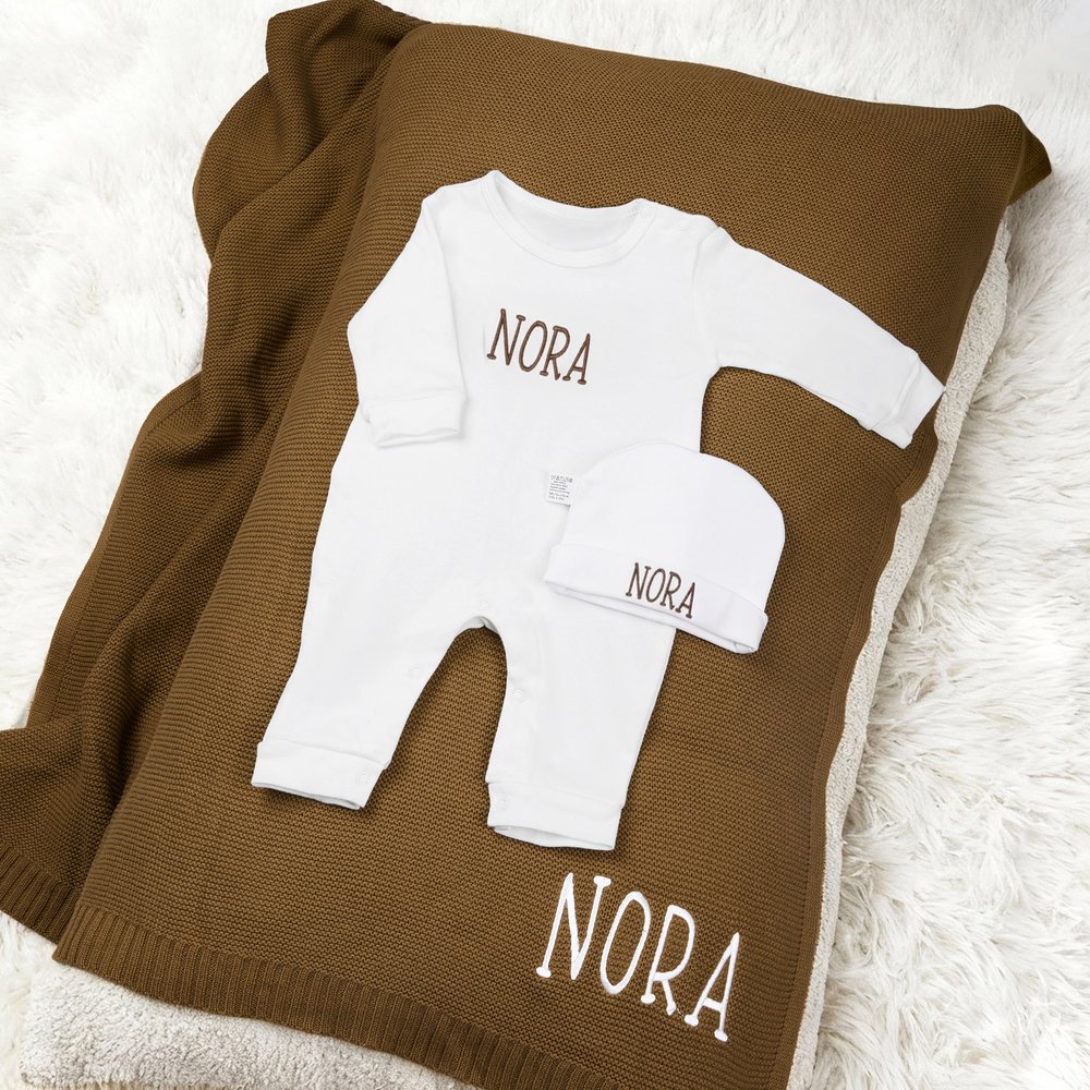 This baby outfit and blanket set features delicate embroidery, with the baby’s name gently stitched onto the clothing, hat, and blanket to create a personalized keepsake. The simple, pure design is available in a variety of soft hues, offering a warm and elegant style that is both practical and a cherished token filled with love and anticipation.