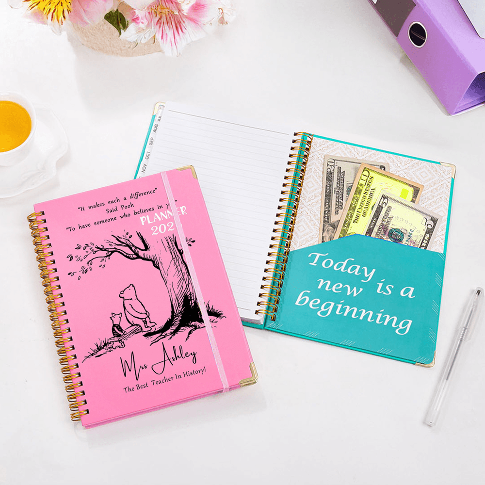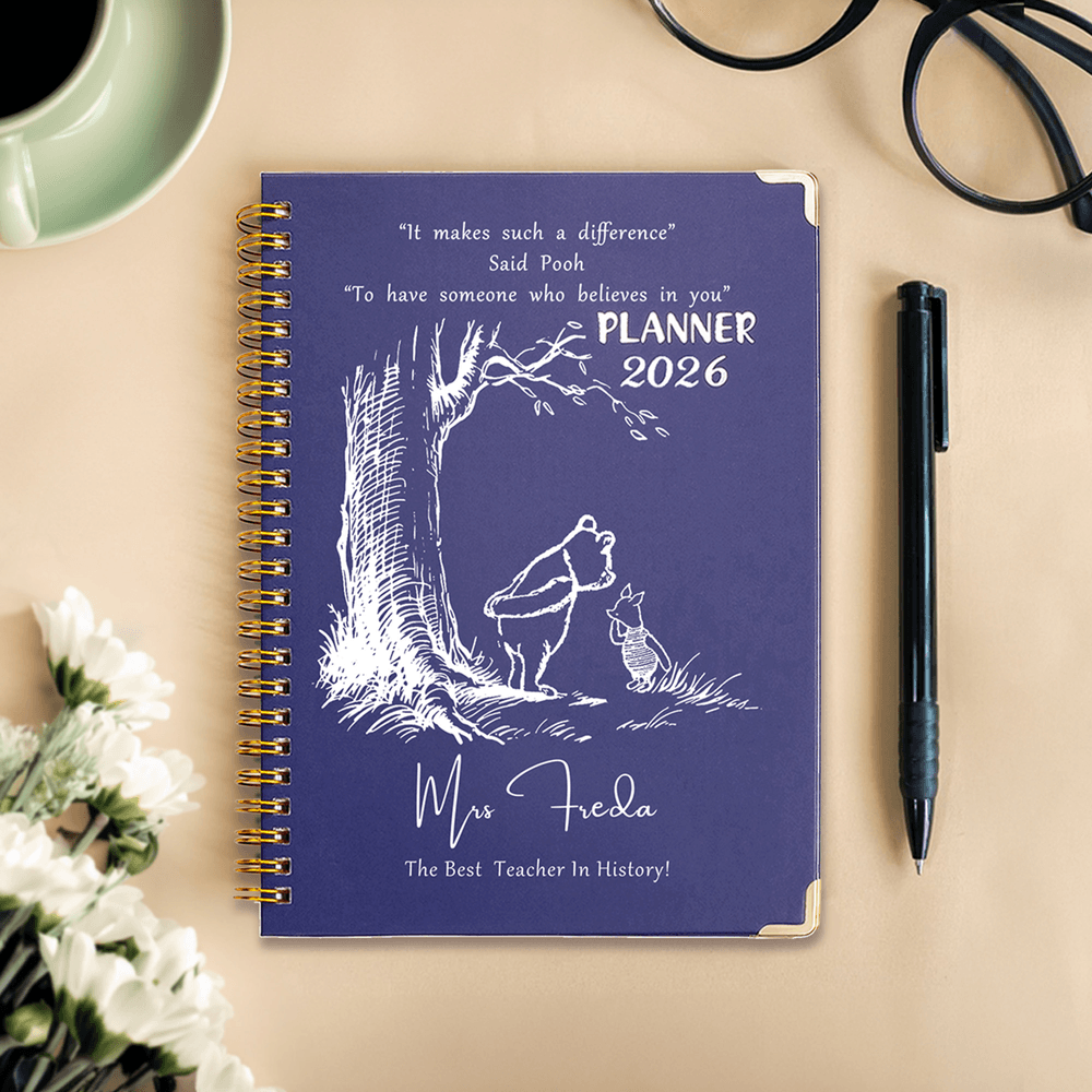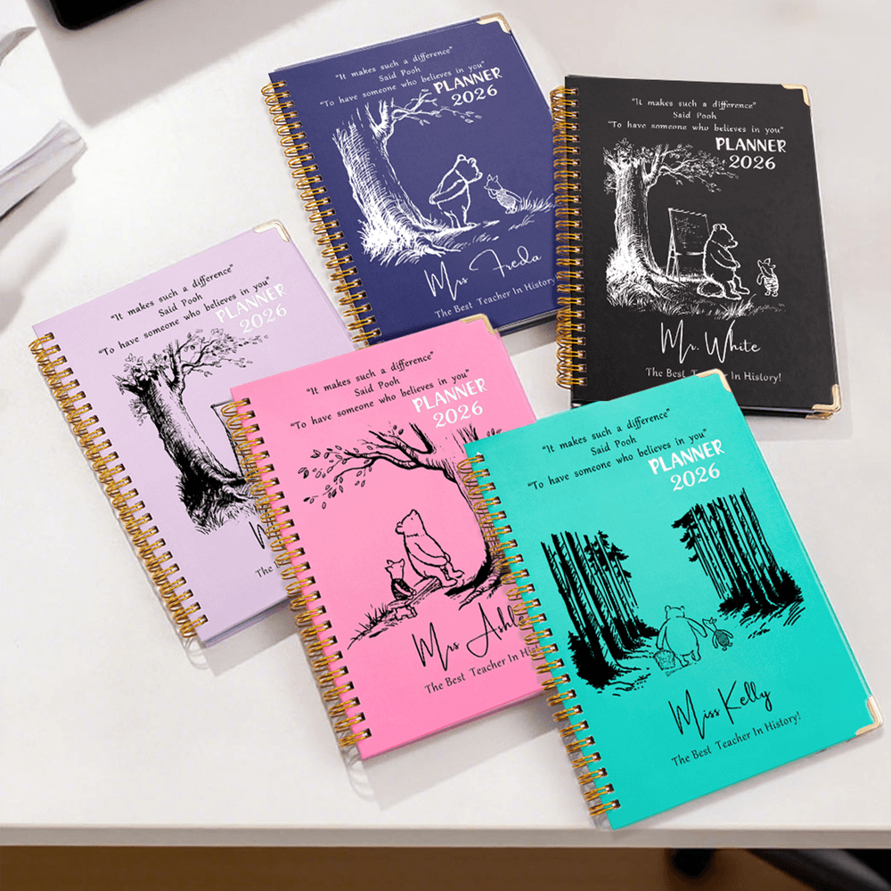 This notebook centers on the heartwarming bond between classic Winnie the Pooh and his friends, mirroring the special connection between teacher and student. Featuring the classic characters from A.A. Milne’s beloved children’s books, each cover can be personalized with custom text and a surname. Available in five colors, it blends timeless storybook charm with individualized meaning, turning every book into a unique keepsake of educational warmth.