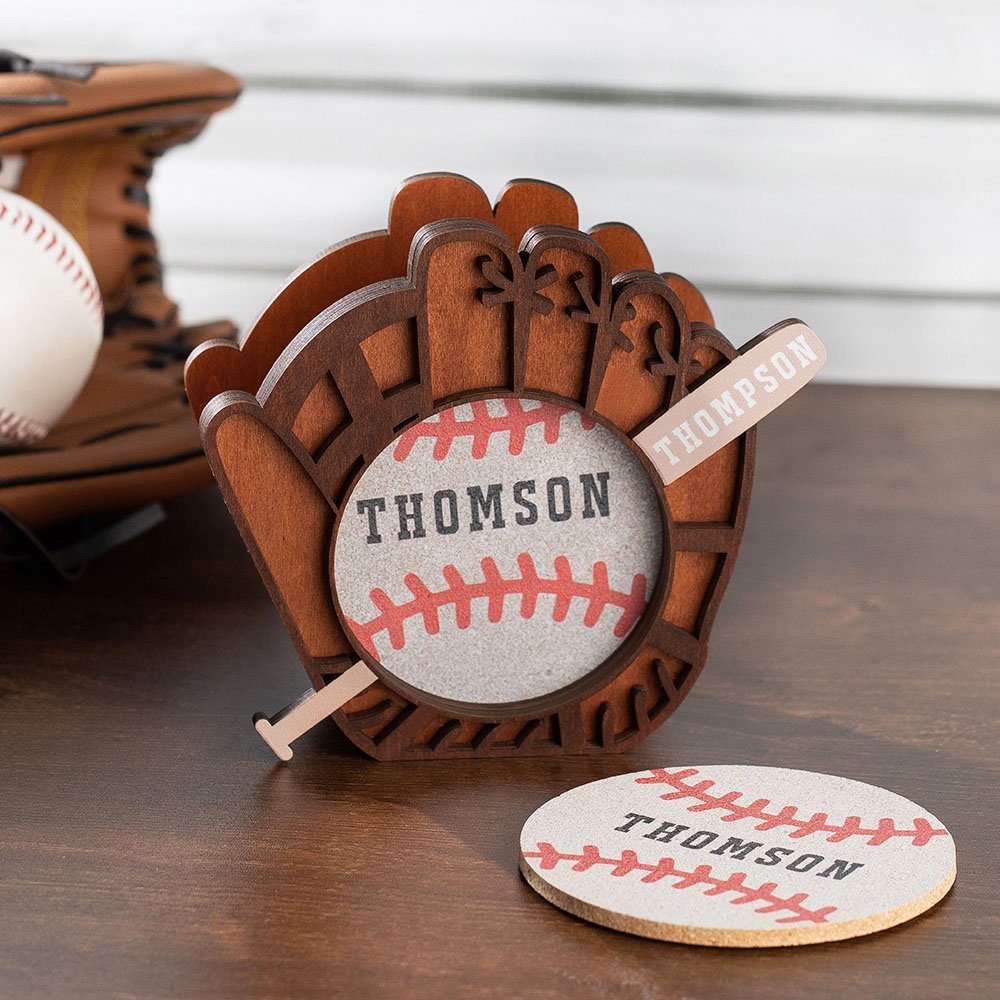 The coaster set has been designed using mainly baseball elements in combination with a gloved catch and out for coasters access. This is a family-ready baseball coasters set that can be customized not only with the family name but also with the number of coasters according to the number of family members. Perfect for baseball fans or families who love baseball.