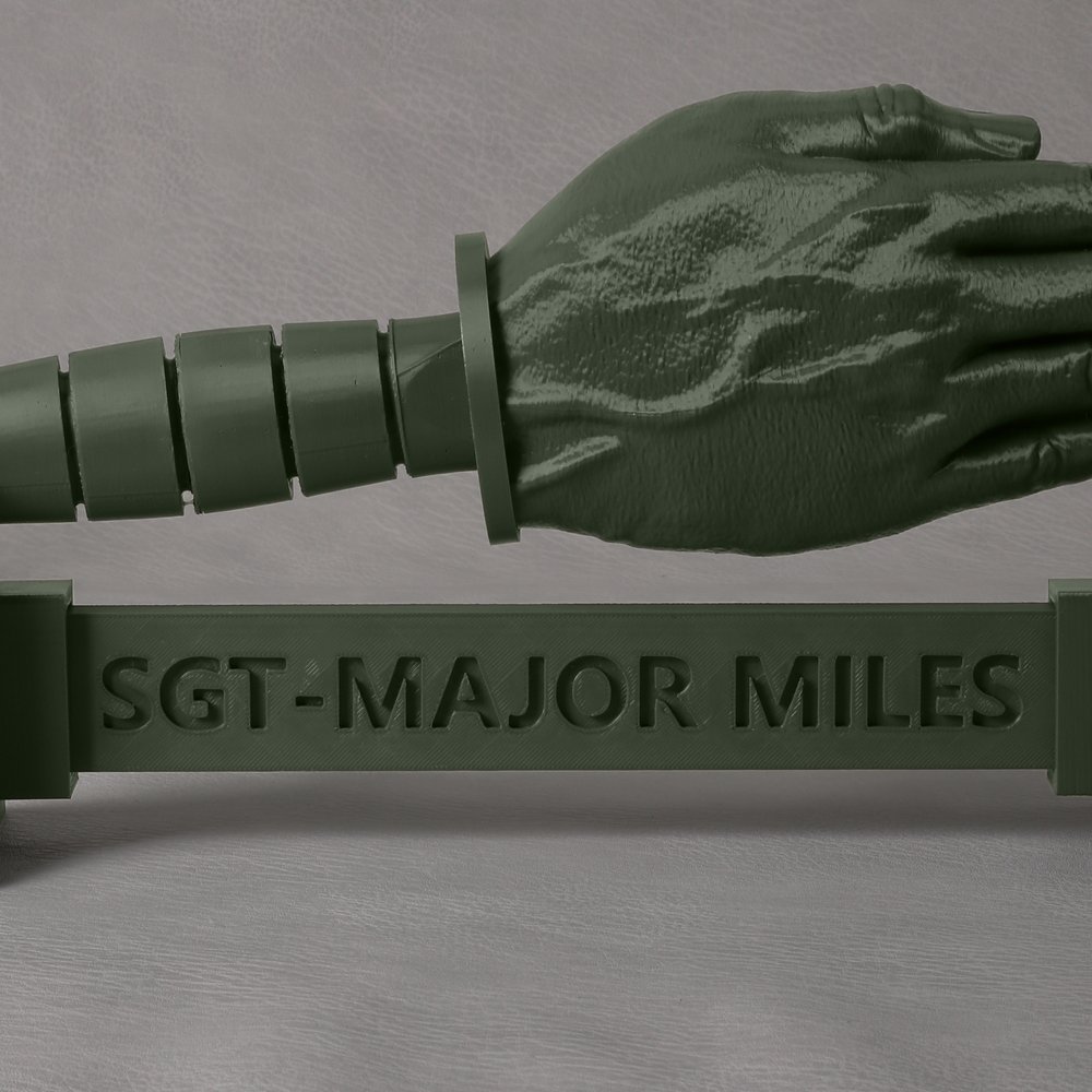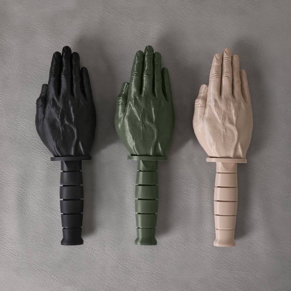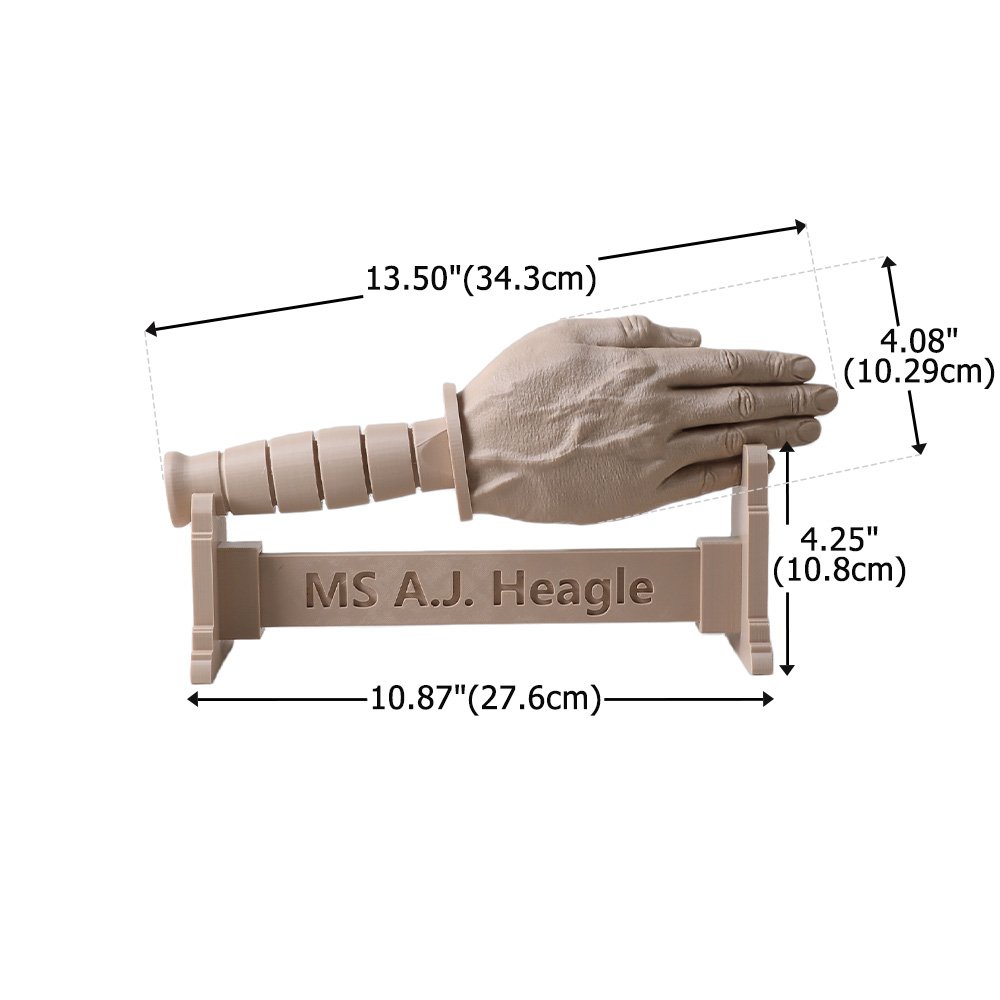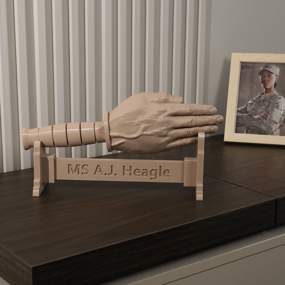 Featuring a blade-free construction, this piece is both safe and compliant, eliminating any regulatory concerns. Crafted using high-precision 3D printing with PLA material, it captures lifelike details—from palm lines and joint creases to handle grip textures—delivering an authentic military aesthetic. Each piece is a custom-built symbol of honor. With multiple color options available, it adapts seamlessly to various desk settings, offering a personalized military keepsake tailored to each individual.