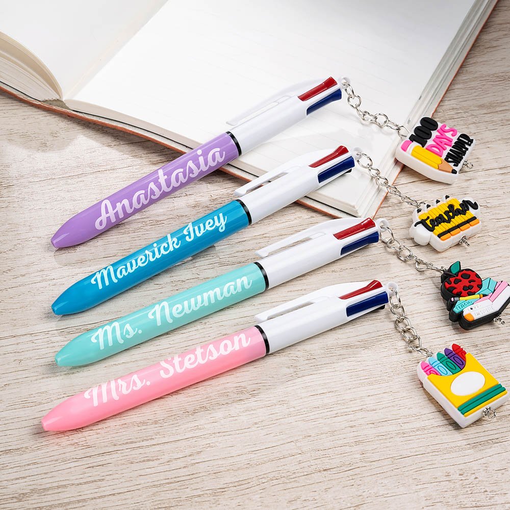 This pen's design is both practical and fun. Its four-color design allows you to quickly switch between blue, black, red, and green inks. Each pen comes with a decorative charm on the top, including pencils, school buses, blackboards, etc. You can choose according to your preferences. You can also customize your name on the pen to make it more unique.