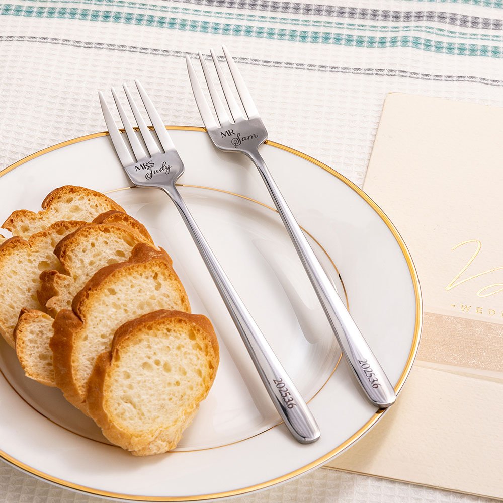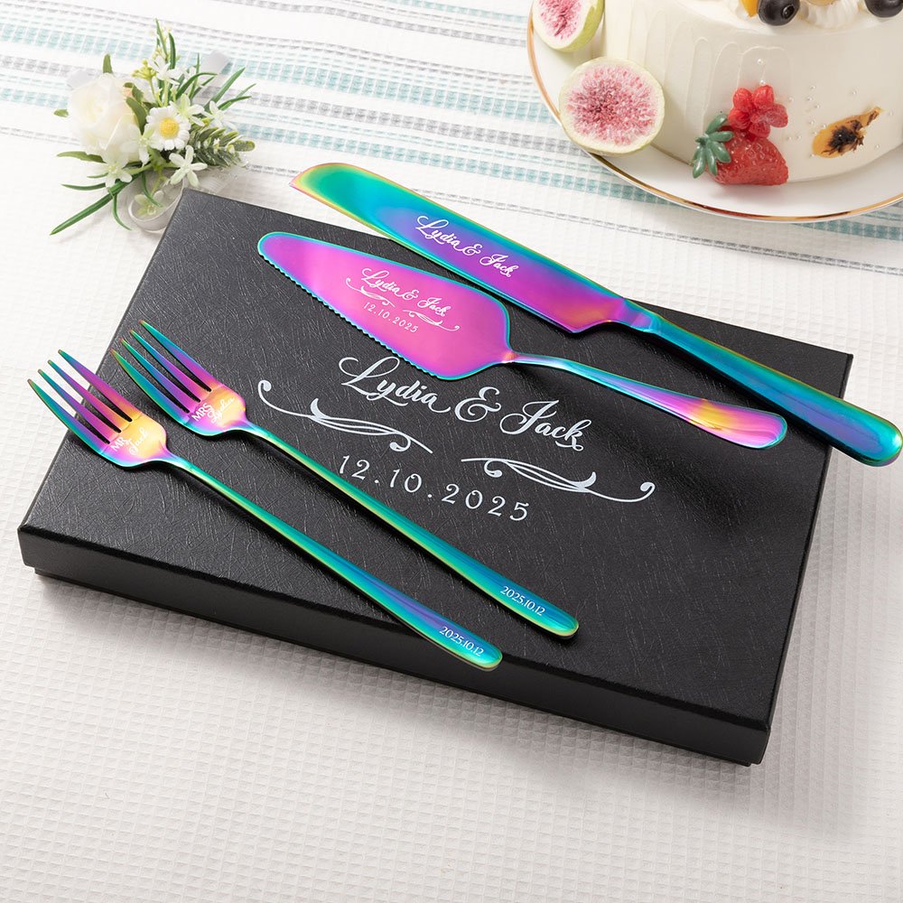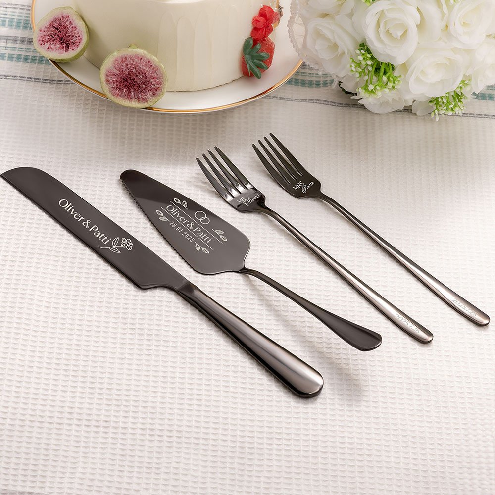 This product is available in both single and complete sets. The set includes a cake knife, fork, spatula, and exquisite storage box. Each piece can be engraved with a name, commemorative date, surname, etc., to freeze the sweet moments for the newlyweds.