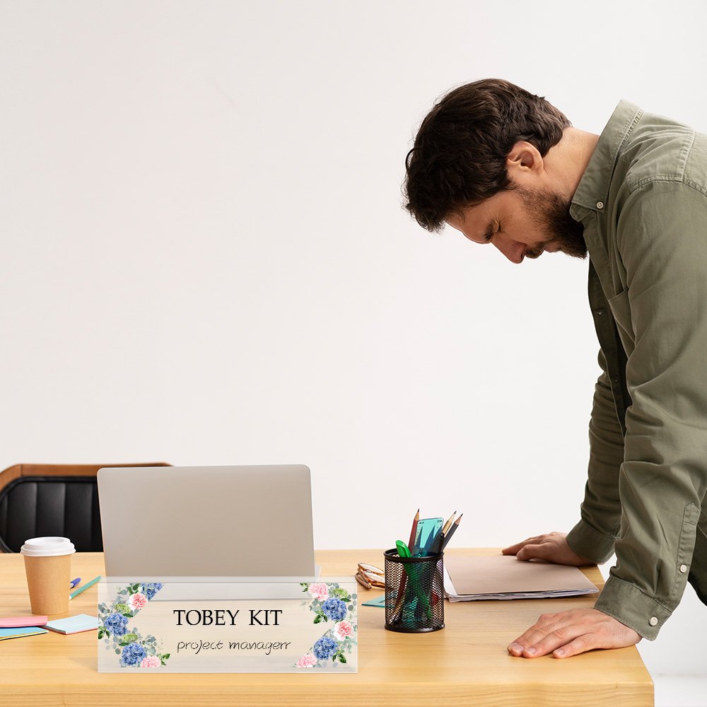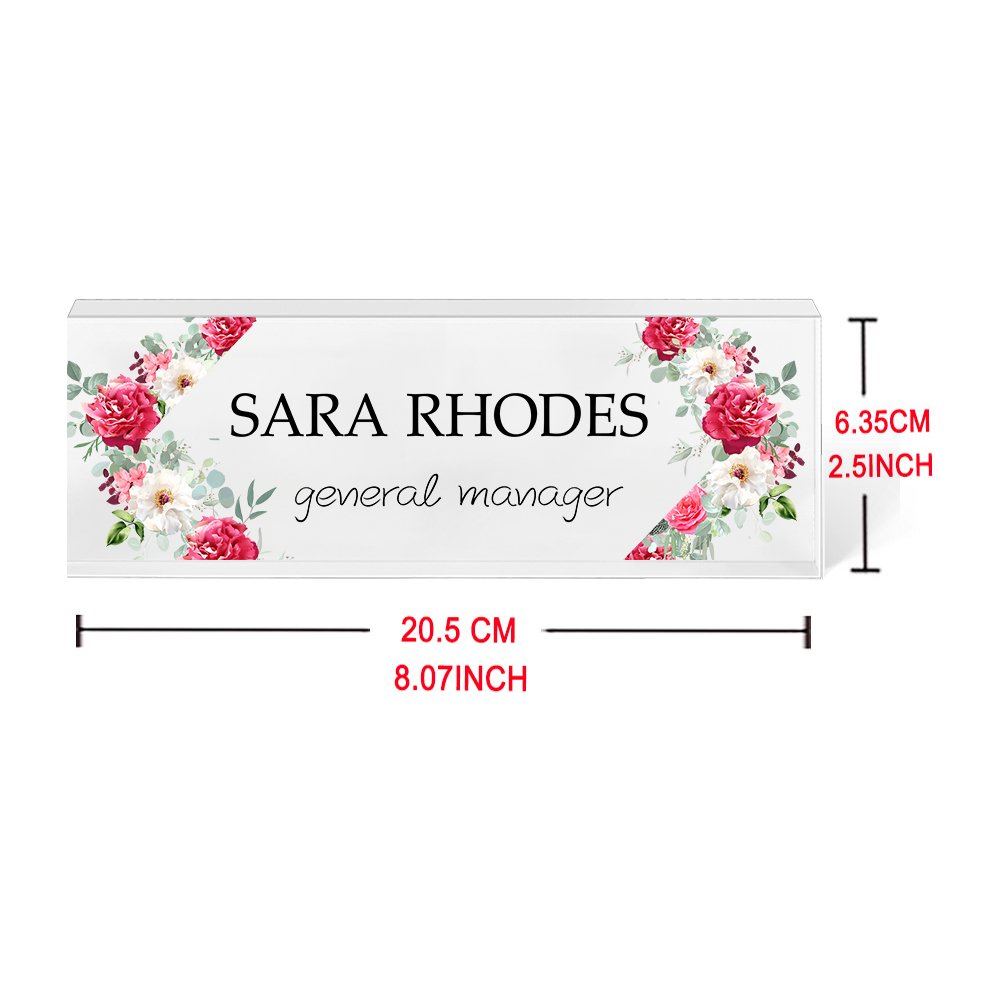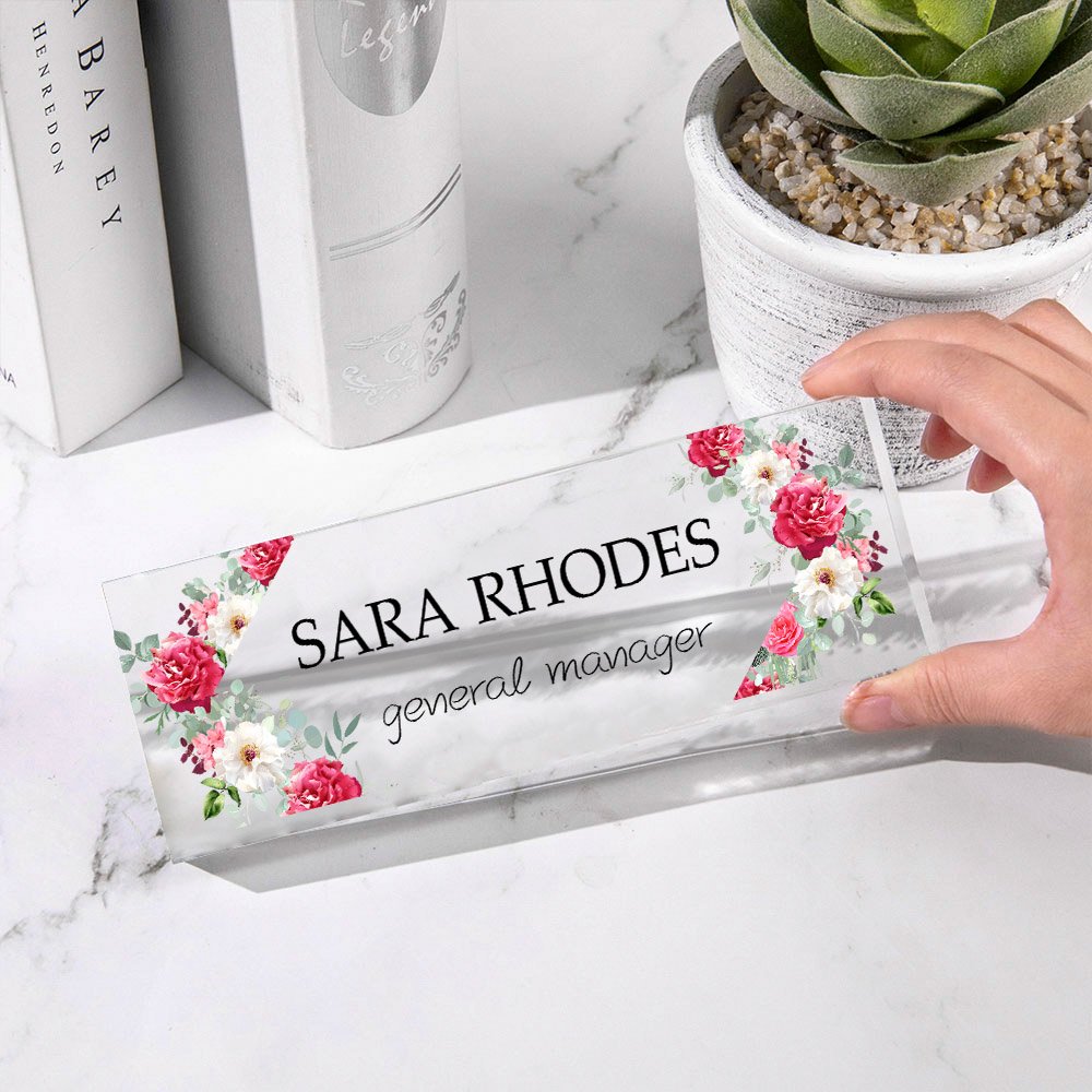 Enhance your workspace with our personalized name signs, a sophisticated addition to any desk or desktop. Choose from two floral colors, blue and pink, and customize it with name and text, making it a thoughtful gift or a stylish addition to your own office space.