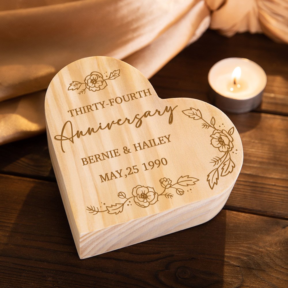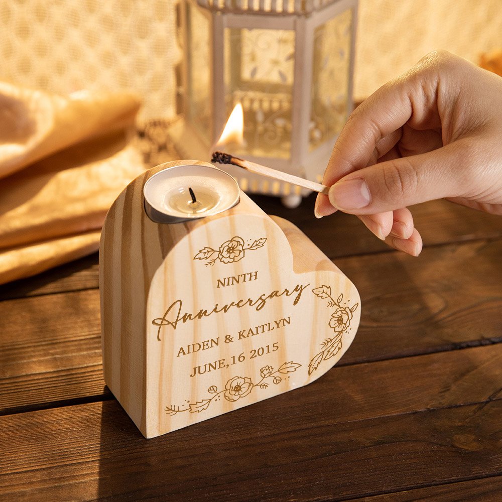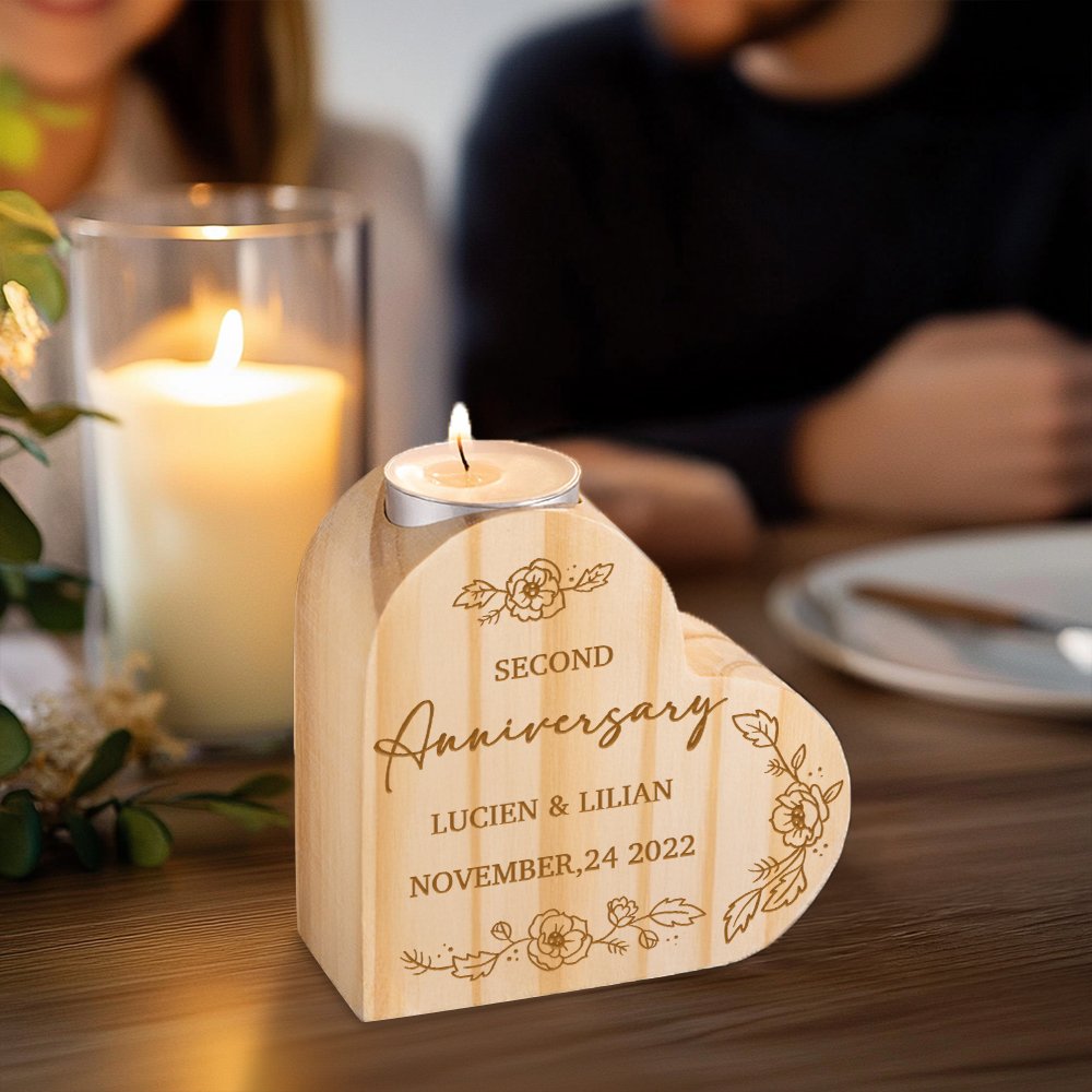 Personalized Anniversary Floral Wooden Heart Shaped Candle Holder with Engraved Name and Date Valentine's Day Anniversary Gift for Couple