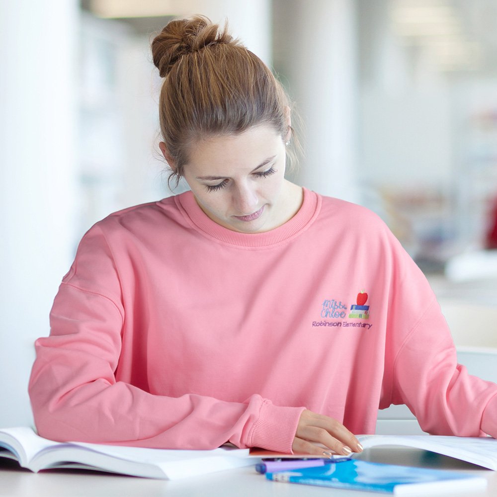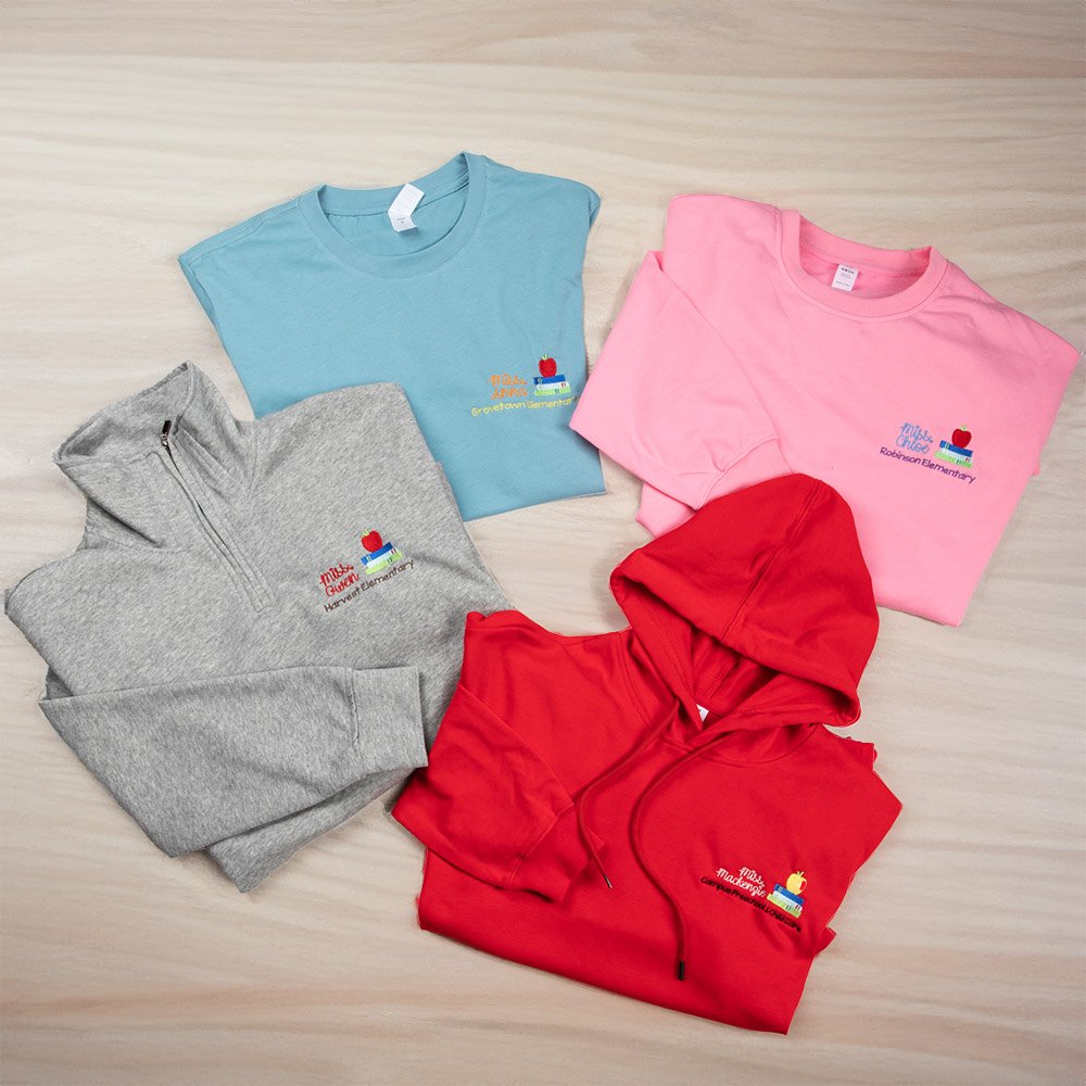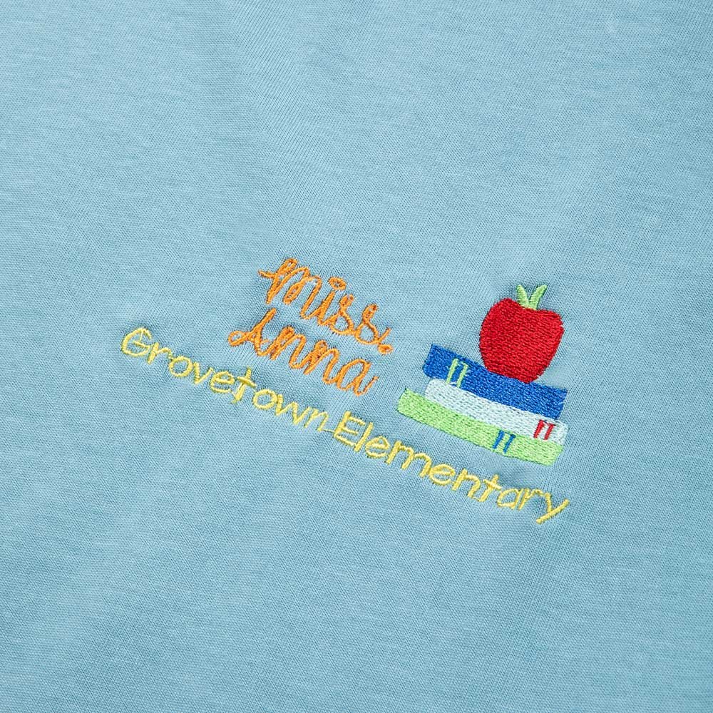 Our clothes are designed with the elements of an apple and a book. The inclusion of these two symbols of education aims to convey respect and appreciation for teachers. In addition, our personalized text is embroidered for a more textured look, and you can add the teacher's name as well as the school's name to the shirt to create a one-of-a-kind gift.