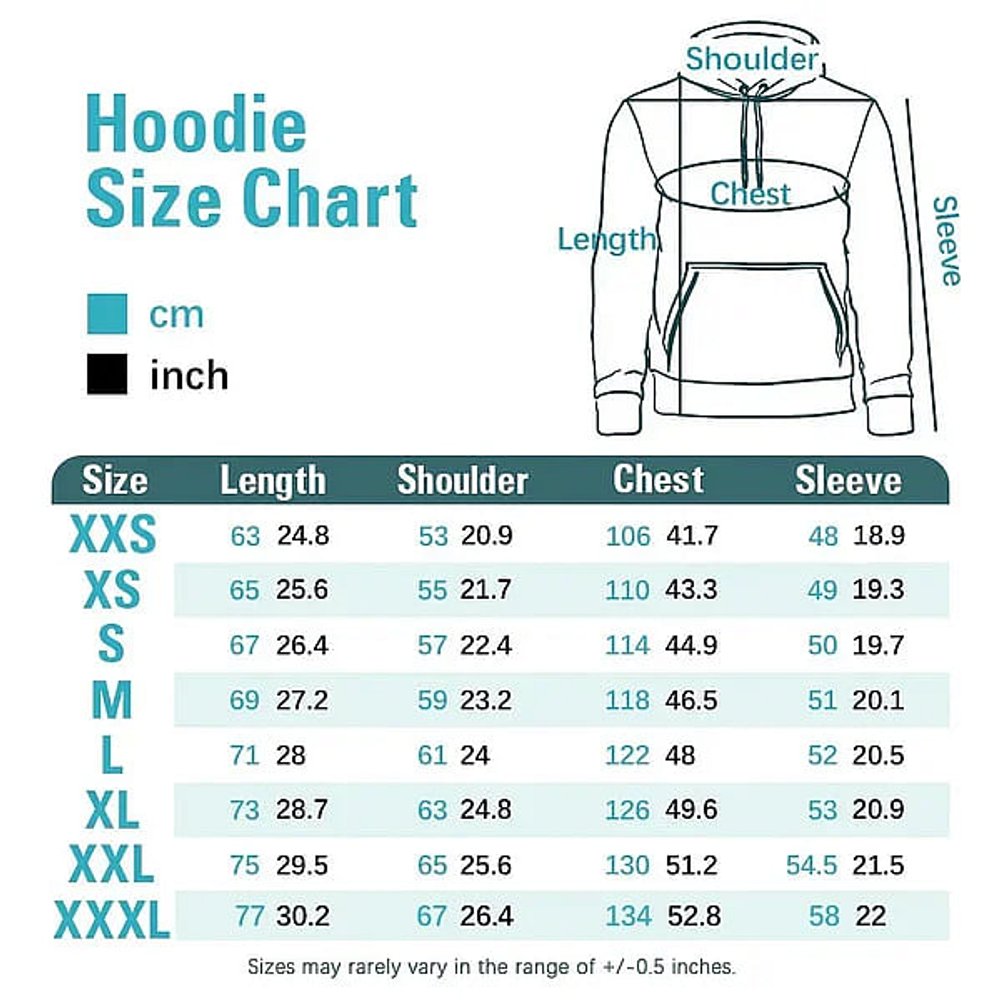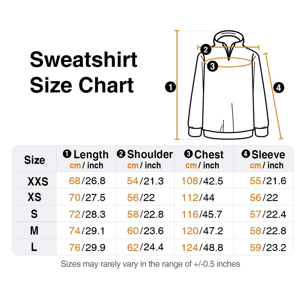 | Measurement: | T-shirt - XXS, XS, S, M, L, XL, 2XL, 3XL, 4XL, 5XL Crew-neck Sweatshirt - XXS, XS, S, M, L, XL, 2XL, 3XL Hoodie - XXS, XS, S, M, L, XL, 2XL, 3XL Turtleneck Sweatshirt - XXS, XS, S, M, L |