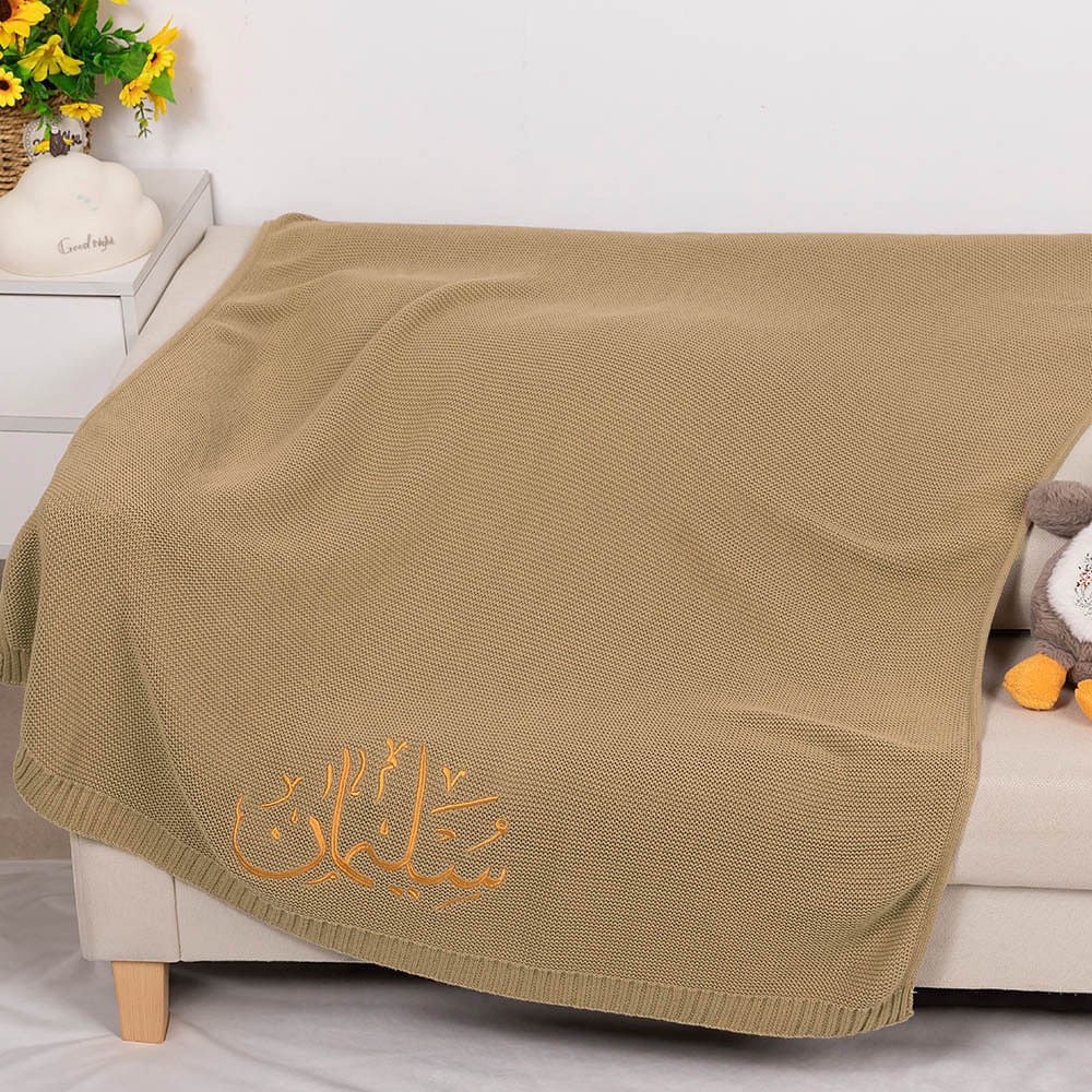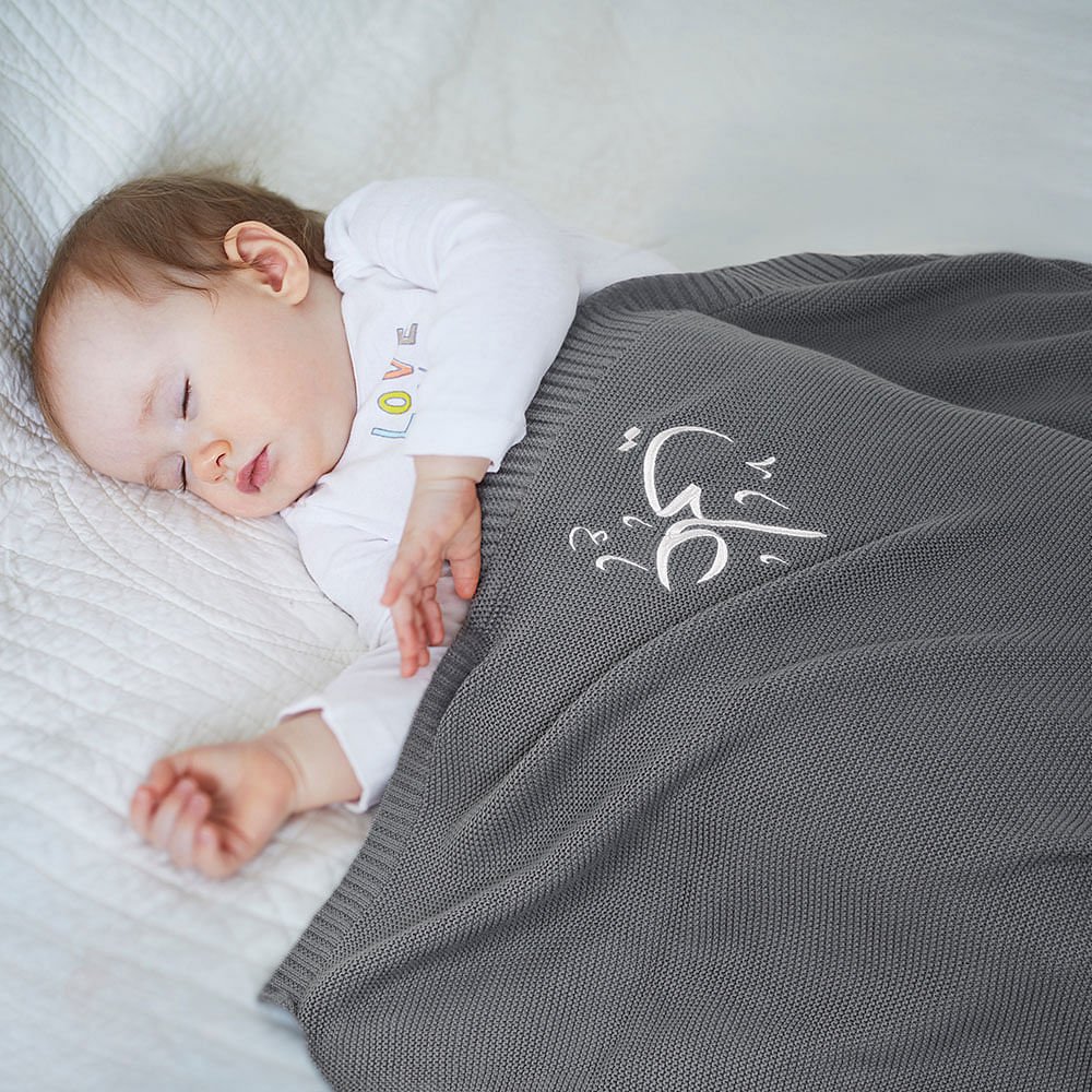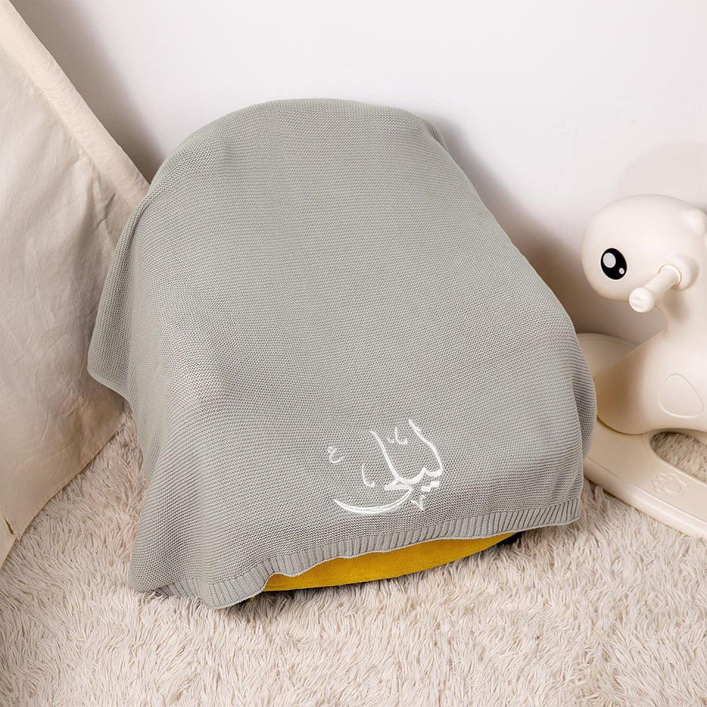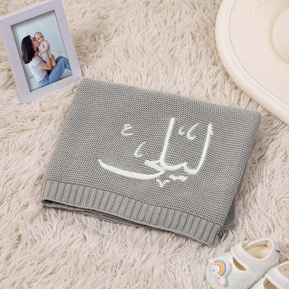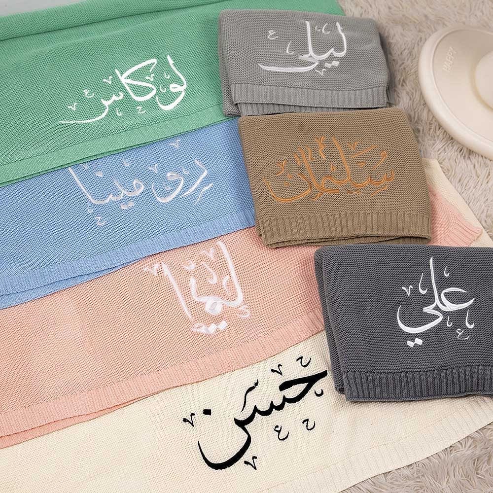 The baby blanket is a stunning blend of artistry and function. Adorned with beautifully embroidered names in elegant Arabic calligraphy, this blanket is a cozy companion for your baby and a unique piece that celebrates cultural heritage and individuality. A selection of ten neutral colors perfectly complements any outfit, making it an ideal gift for both boys and girls.