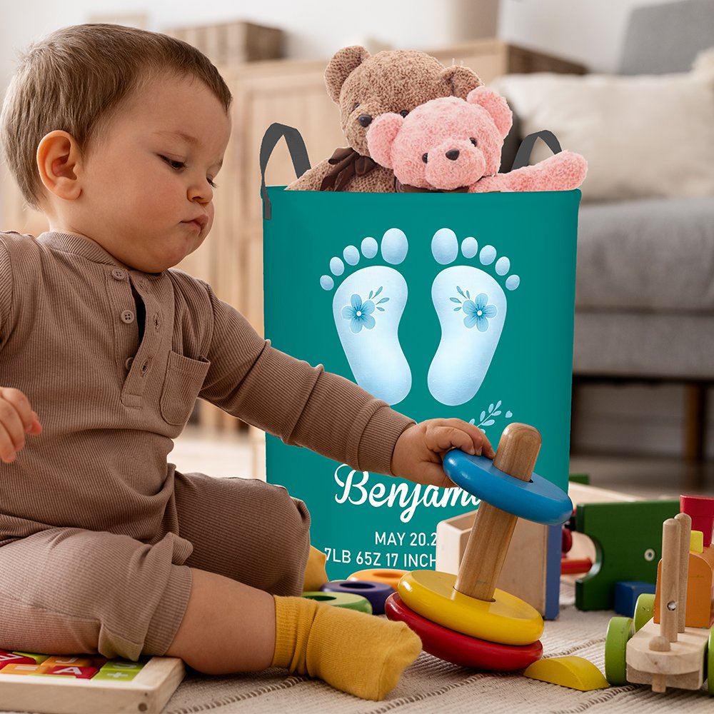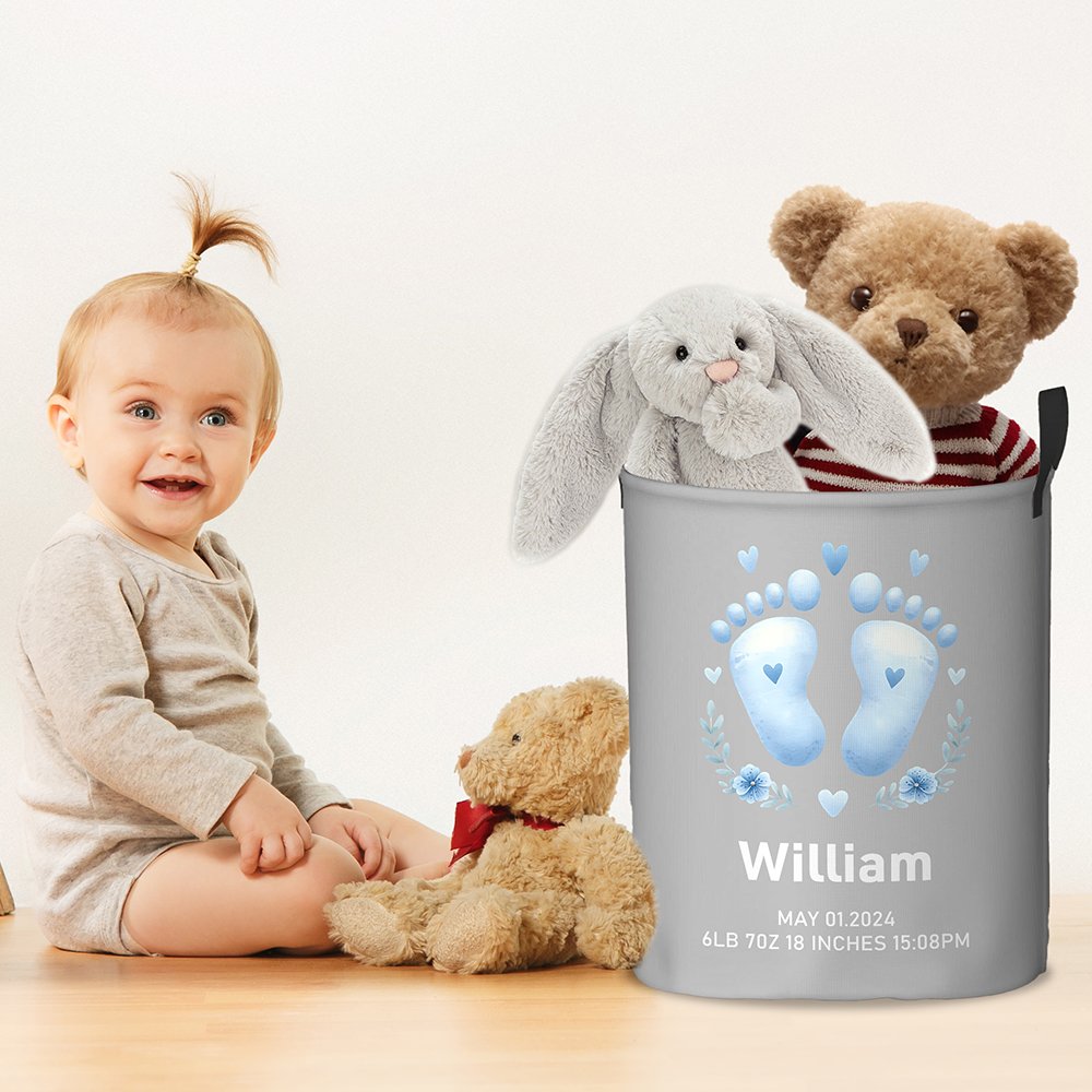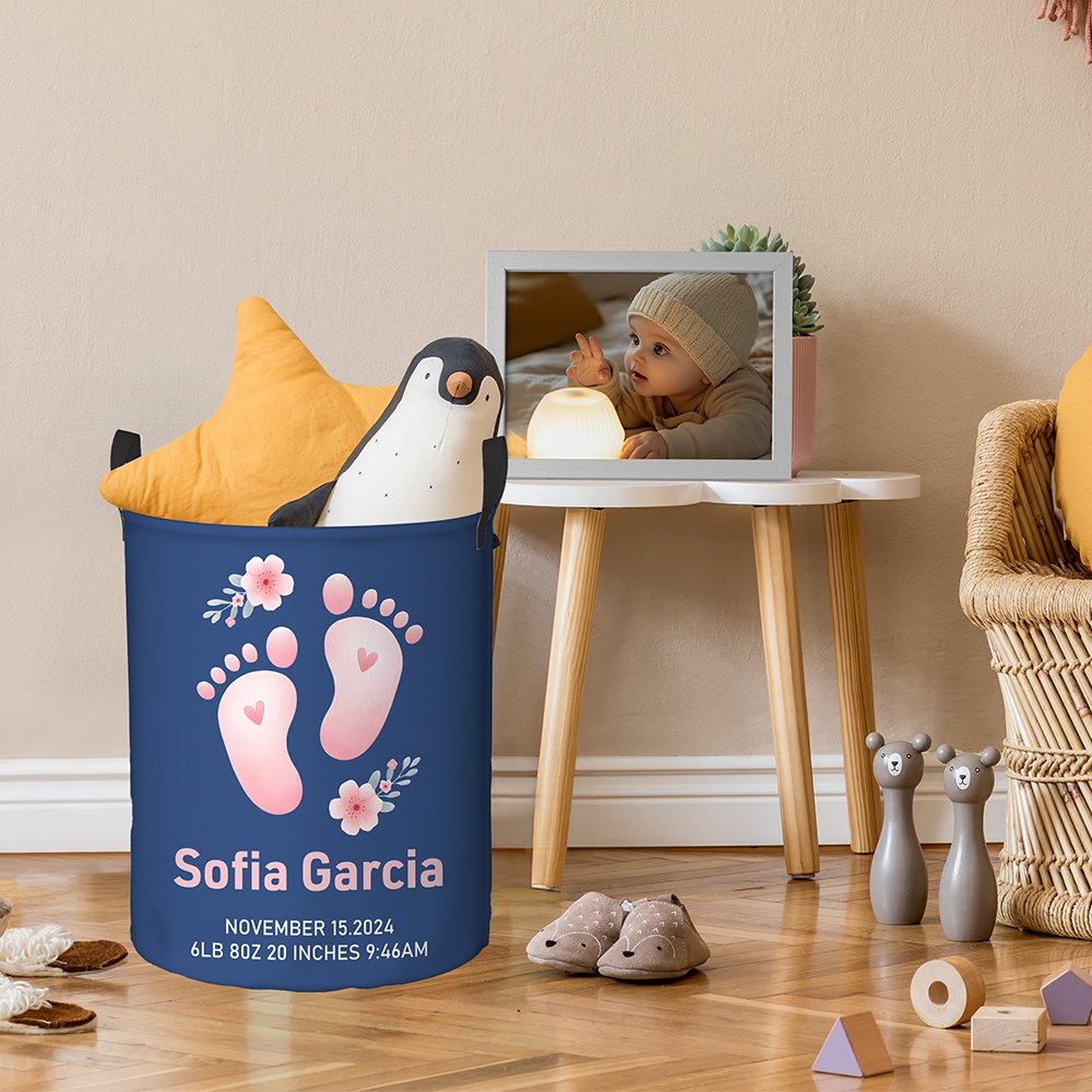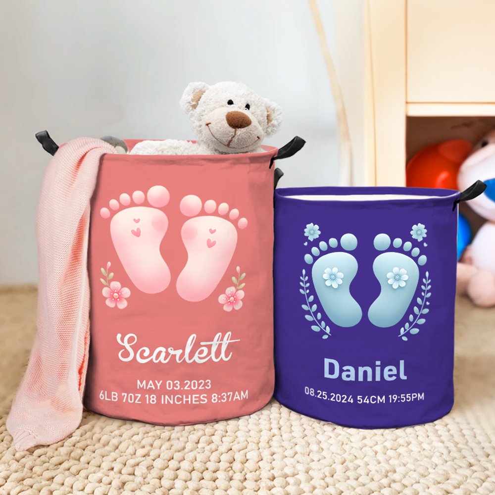The laundry basket features adorable pink or blue baby footprint designs and customizable baby's name and birth information. With up to 17 different basket colors, it perfectly matches your and your baby's preferences. This basket is the ideal choice to express your best wishes for newborns.