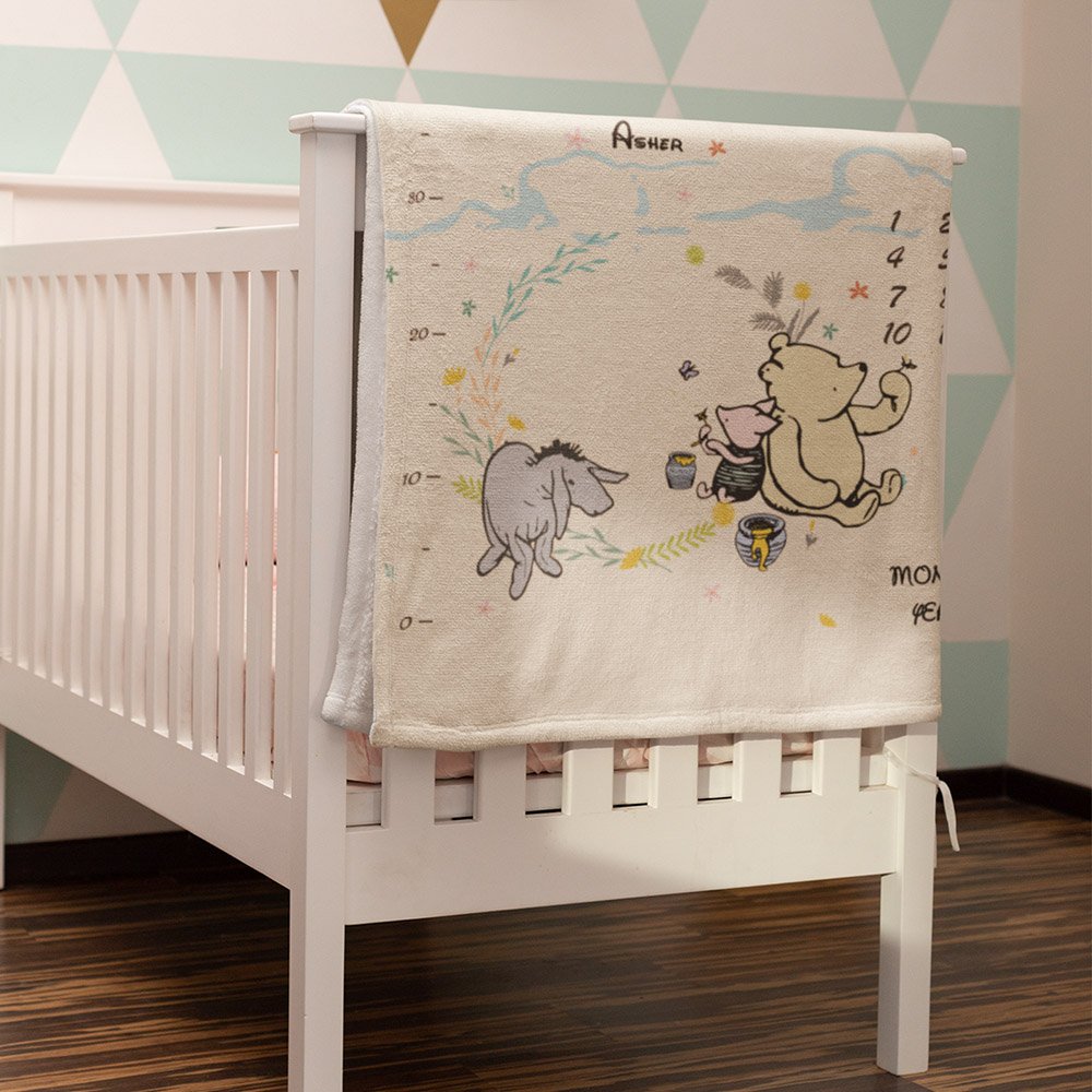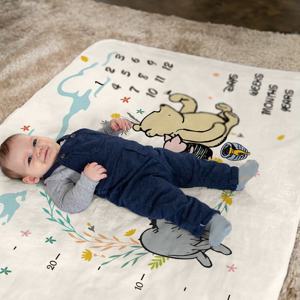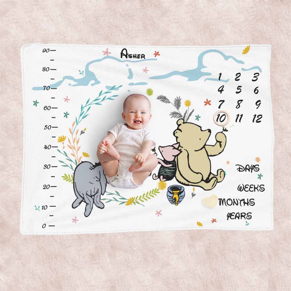 The growth chart blanket with classic Winnie the Pooh created by the renowned author A. A. Milne makes a soft, warm backdrop to capture your baby’s first year of weekly and monthly milestones on camera forever. You can personalize your baby's name on it and share your photos with family & friends! We will give away three accessories with rings, stars and hearts to decorate when taking pictures, let's create a beautiful album from the one-month milestone to twelve months.