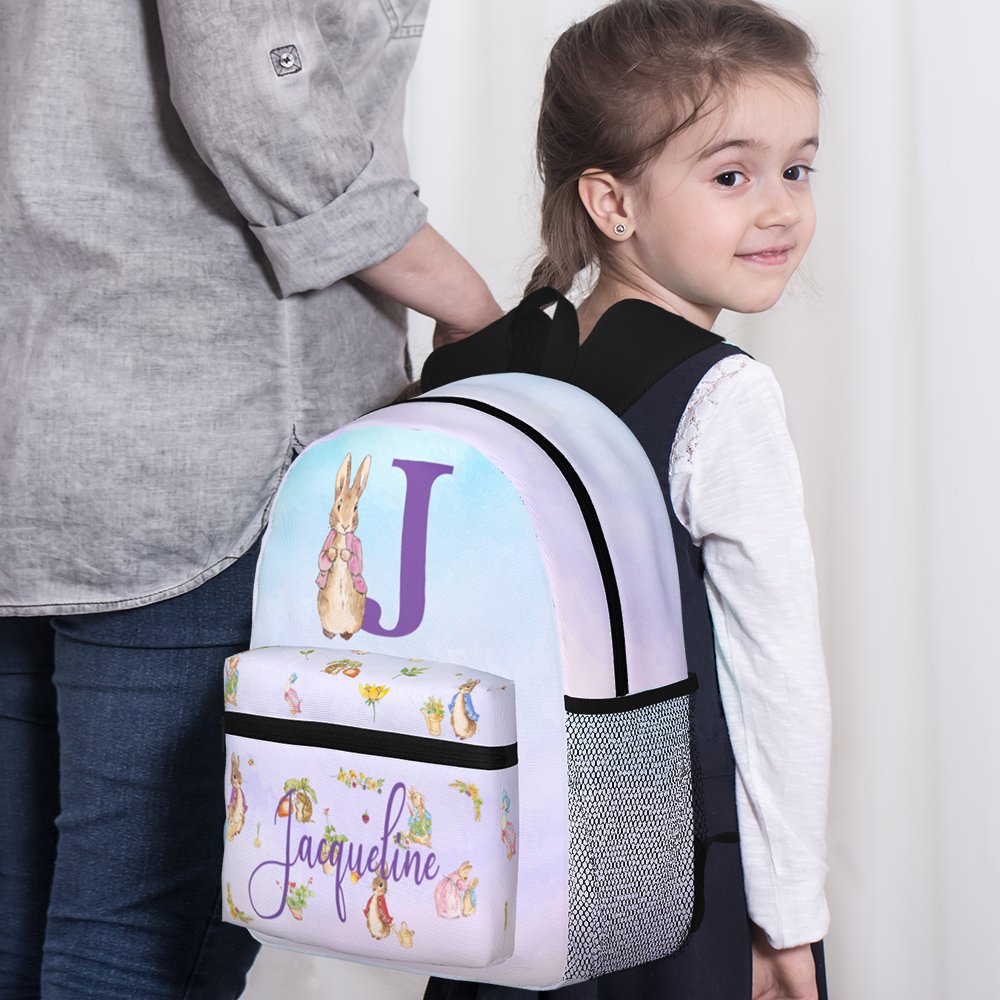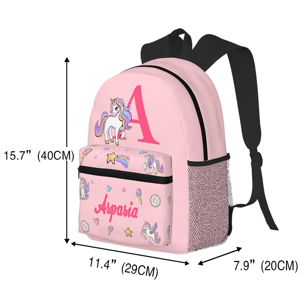 This is a customized school bag for a child that has 11.4 Γ 15.7 Γ 7.9 Inches, one main pocket with an inner compartment, one pocket in front, and one mesh pocket on each side with adequate capacity for the child's daily and school supplies and the multi-pocket design gives your children a habit of categorizing. There will be room for school supplies, a school book, a lunch box, and a water bottle for your child to carry.