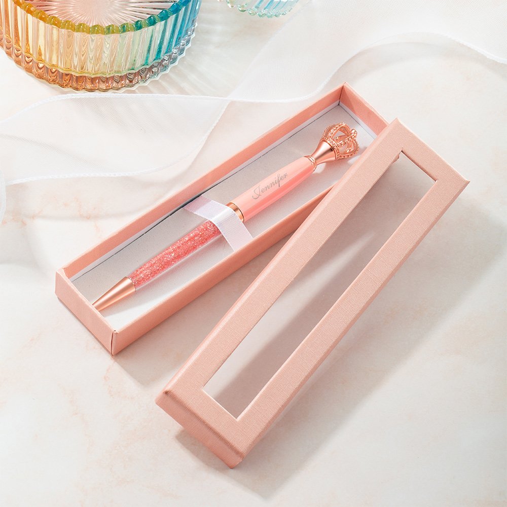 There are five styles (crown/flower/dynamic liquid flower/diamond/flower with gems). Each style can choose different colors at the same time. And each pen can customize the laser-engraved name or text on the pen tube.