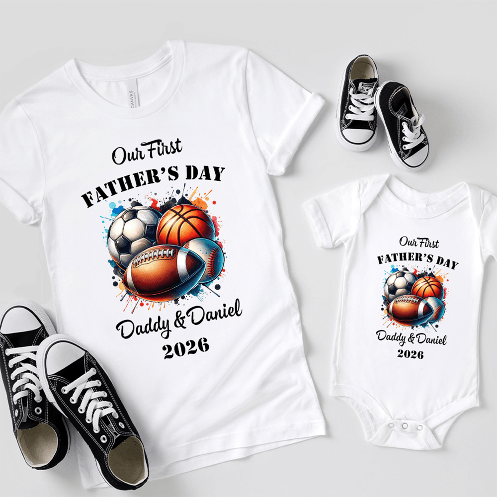 Personalized Balls Pattern Our First Father's Day 100% Cotton T-shirt Baby Bodysuit with Name and Year Birthday Father's Day Gift for Baby Father
