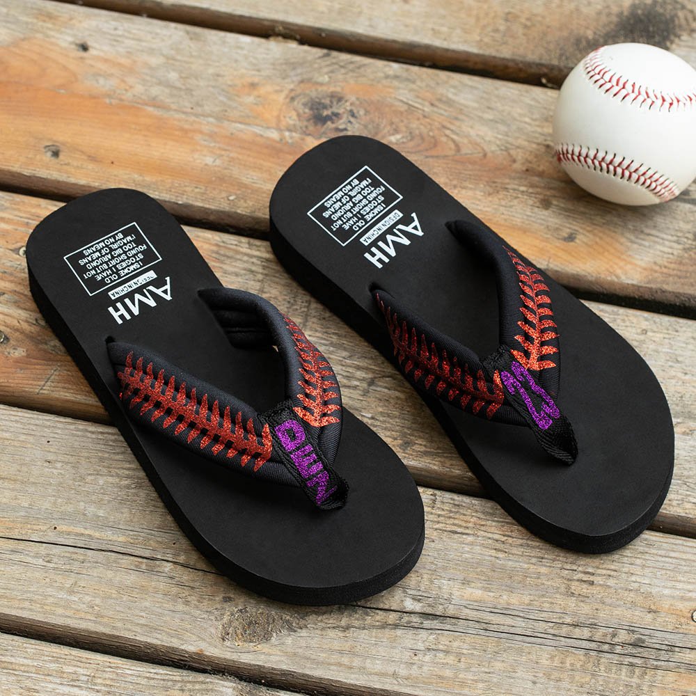 Our flip-flops are unique and comfortable. The design is a trend going with summer stylish outfits. Lightweight and convenient slip-on design. These fabulous personalized flip-flops are perfect for the season and add to your game-day wear! Customizable with player names, numbers, or whatever, these sandals are perfect for showing off your love for the sport or supporting your favorite players!