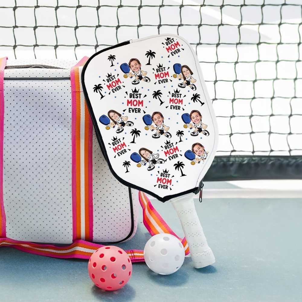 This pickleball paddle cover features a classic and simple white color, decorated with cartoon pickleball players and elements of coconut trees and blue stars, exuding summer dynamics and vitality, with the fixed words "BEST....EVER". You can add title customization to establish the theme of this product, and upload 1-7 children's avatar photos to customize the image of the cartoon pickleball player, celebrating the special bond between fathers and children.