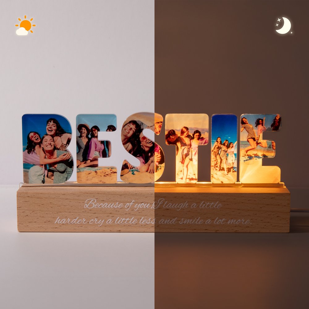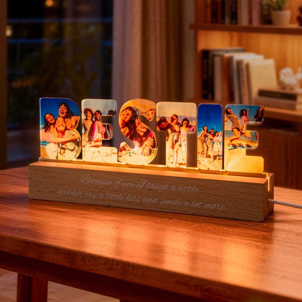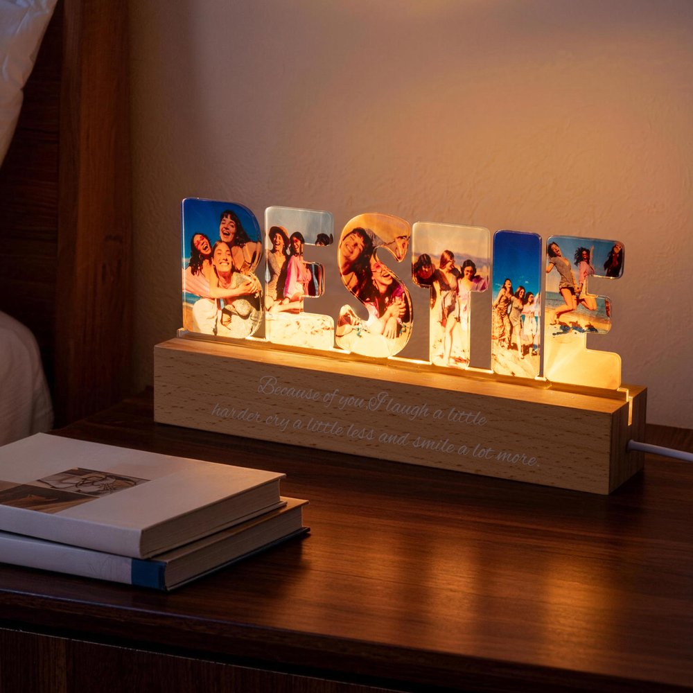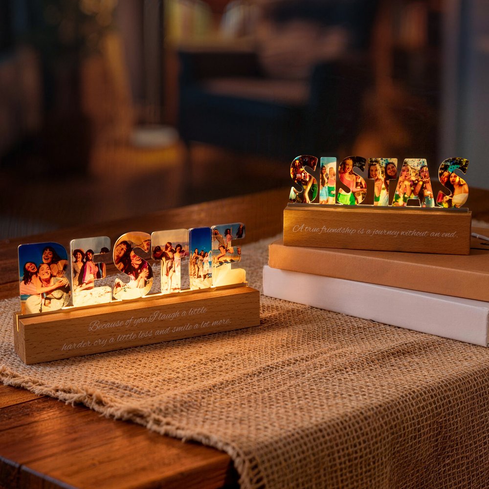 You can create a one-of-a-kind night light by choosing from four friendship-themed word options, including SISTAS, SISTER, BESTIE, and FRIEND. Upload up to six of your favorite photos to fill the letters, and select one of five heartfelt friendship quotes to print on the wooden base. This level of personalization turns a simple light into a meaningful tribute to your bond, preserving your most cherished memories in a glowing display.