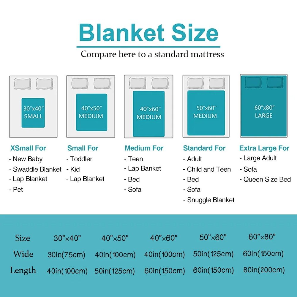 | Measurement: | Fleece Blanket: 30" Γ 40"(75cm Γ 100cm), 40" Γ 50"(100cm Γ 125cm), 50" Γ 60"(125cm Γ 150cm), 60" Γ 80"(150 Γ 200cm), Sherpa Blanket: 40" Γ 50"(100cm Γ 125cm), 50" Γ 60"(125cm Γ 150cm), 60" Γ 80"(150 Γ 200cm) |