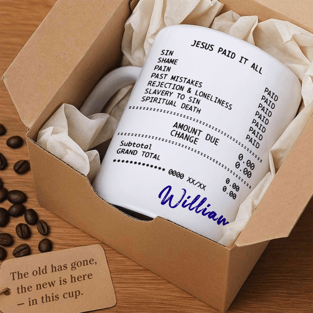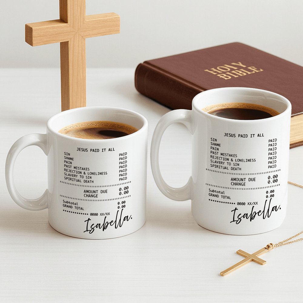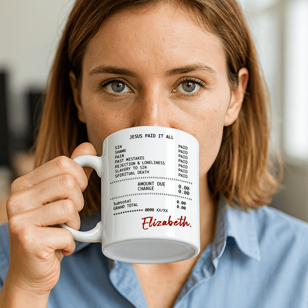 This mug ingeniously incorporates the format of an everyday receipt to convey the faith declaration that "Jesus Paid It All." Featuring "JESUS PAID IT ALL" as the header, the design likens sin, shame, and pain to settled debts. Through its witty yet profound concept, it communicates the spiritual message that "grace has been paid, and you are set free," bringing the truth of faith vividly into daily life.