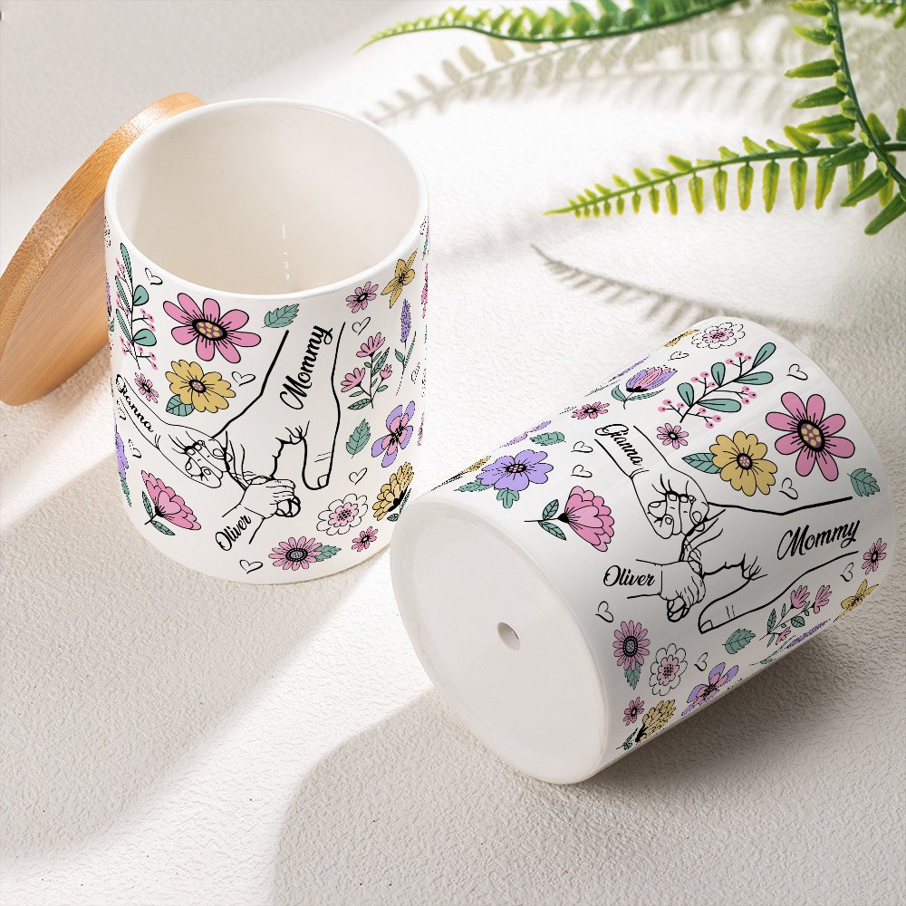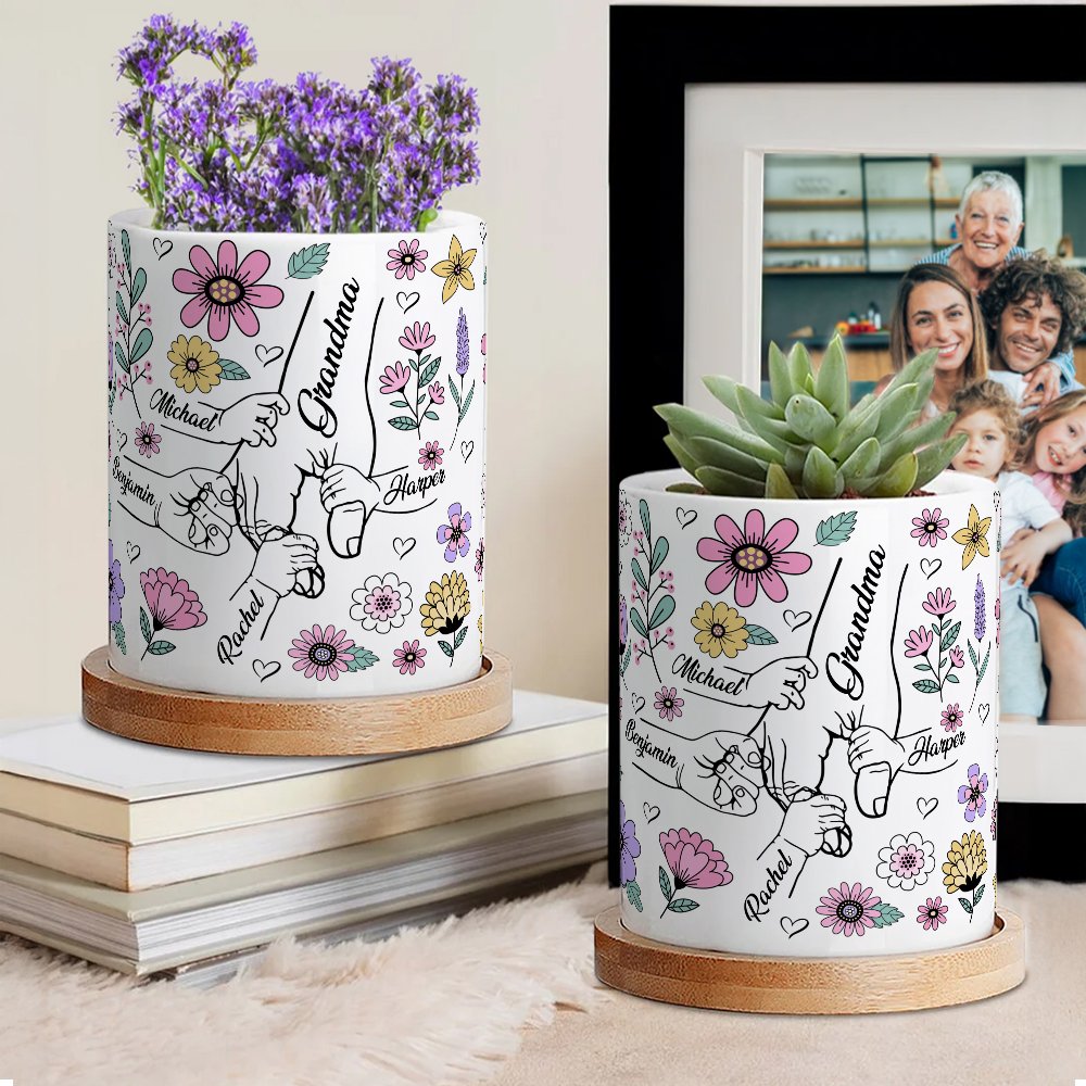 Personalized Big Hand Holding Small Hands Floral Ceramic Planter Pot with Drainage and Bamboo Base Birthday Mother's Day Gift for Mom Grandma