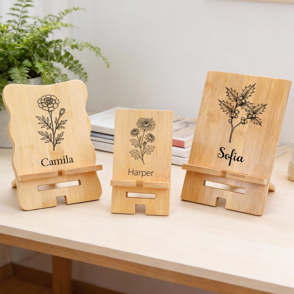 This bamboo phone holder features custom birth flowers and personalized names, with two size options and two distinct shape styles to choose from. The floral and sleek wooden design adds a delicate, personalized touch, blending beauty and practicality. It lets you create a one-of-a-kind accessory that matches your style or honors someone special with their birth flower.