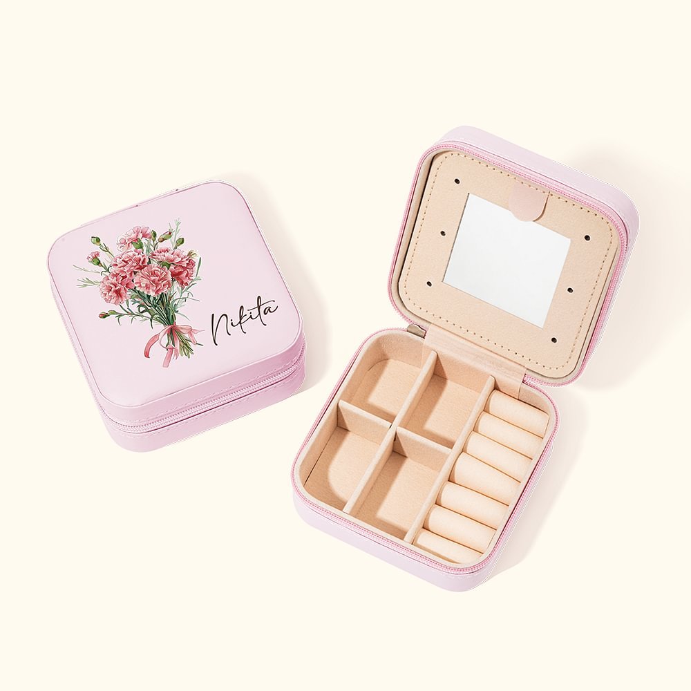 Our birth flower bouquet jewelry box is a unique and heartfelt gift. It features her birth flower and name beautifully printed on the lid, adding a personal style that celebrates her individuality.