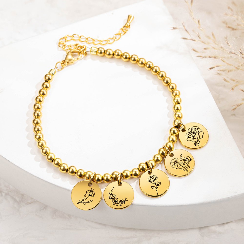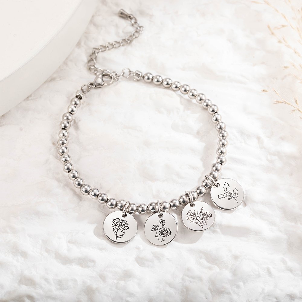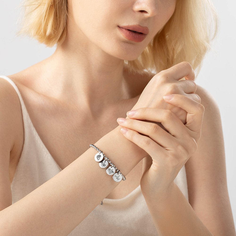 You can choose the color of the bracelet and customize 1 to 8 discs engraved with birth flowers, expressing your heartfelt love.