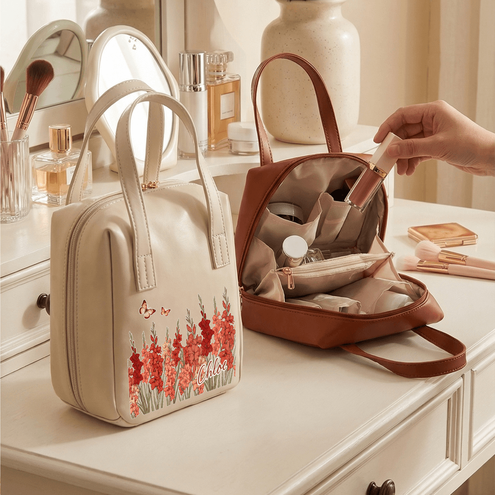 The interior features smart, divided compartments for organized storage of lipsticks, eyeshadows, foundations, brushes, and more — no more mess. Its compact size and hand-carry design make it easy to bring to work, on trips, or to the gym, allowing for quick touch-ups anytime, anywhere. With its custom birth flower and name design, every makeup session becomes a moment of ritual and joy, weaving a personal touch into your daily beauty routine.
