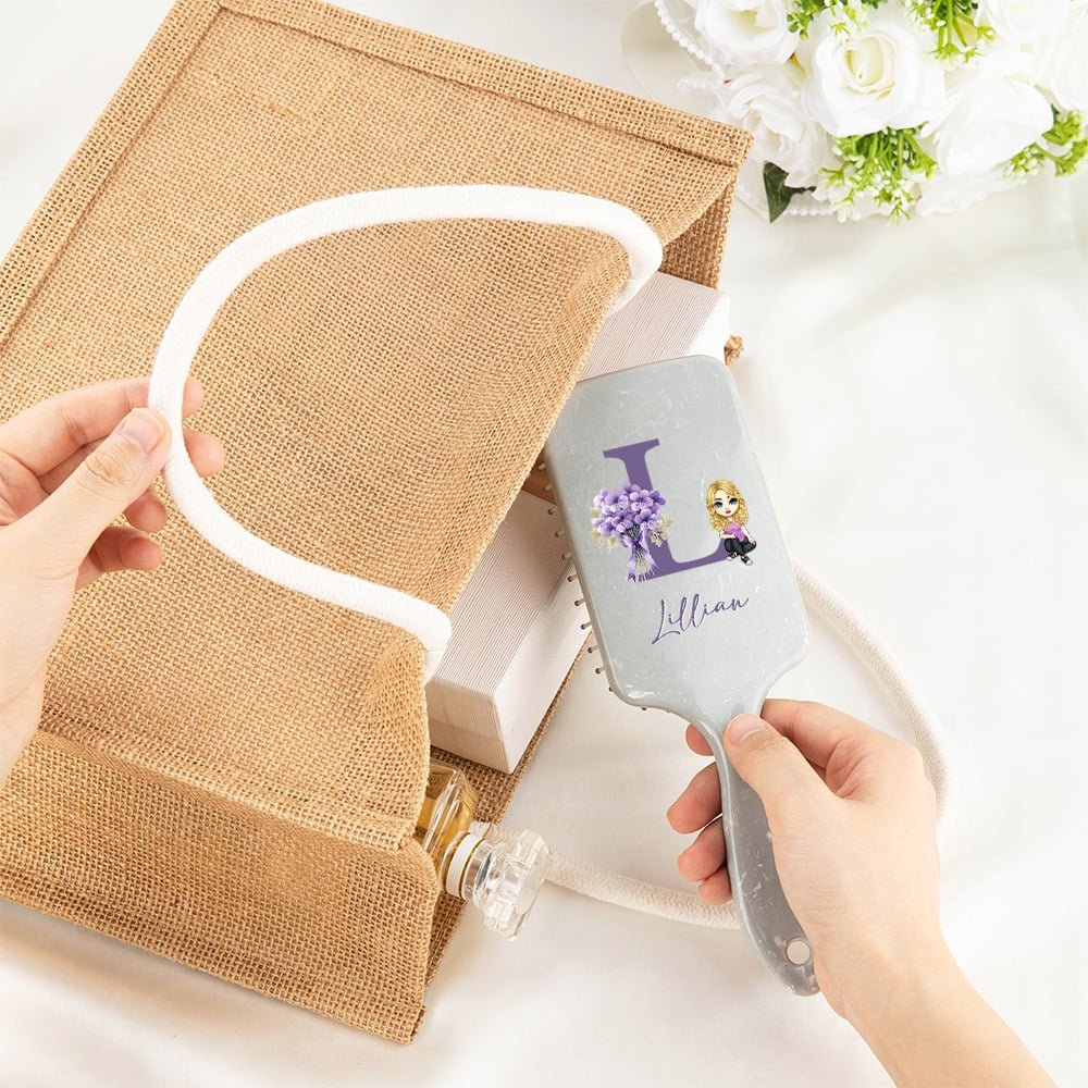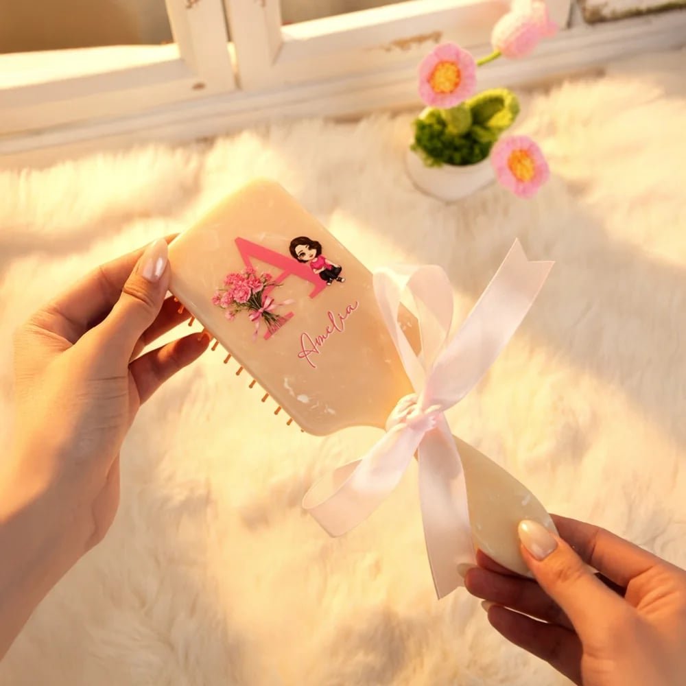 This paddle brush is inspired by birth flower bouquet, combined with initials and cute cartoon characters. Each paddle brush can be customized according to the customer's name, which is more recognizable and commemorative. The paddle brush is available in three colors, with a marble-like texture that adds a touch of elegance. You can choose the perfect style that best suits your personality, ensuring that your comb is one of a kind.
