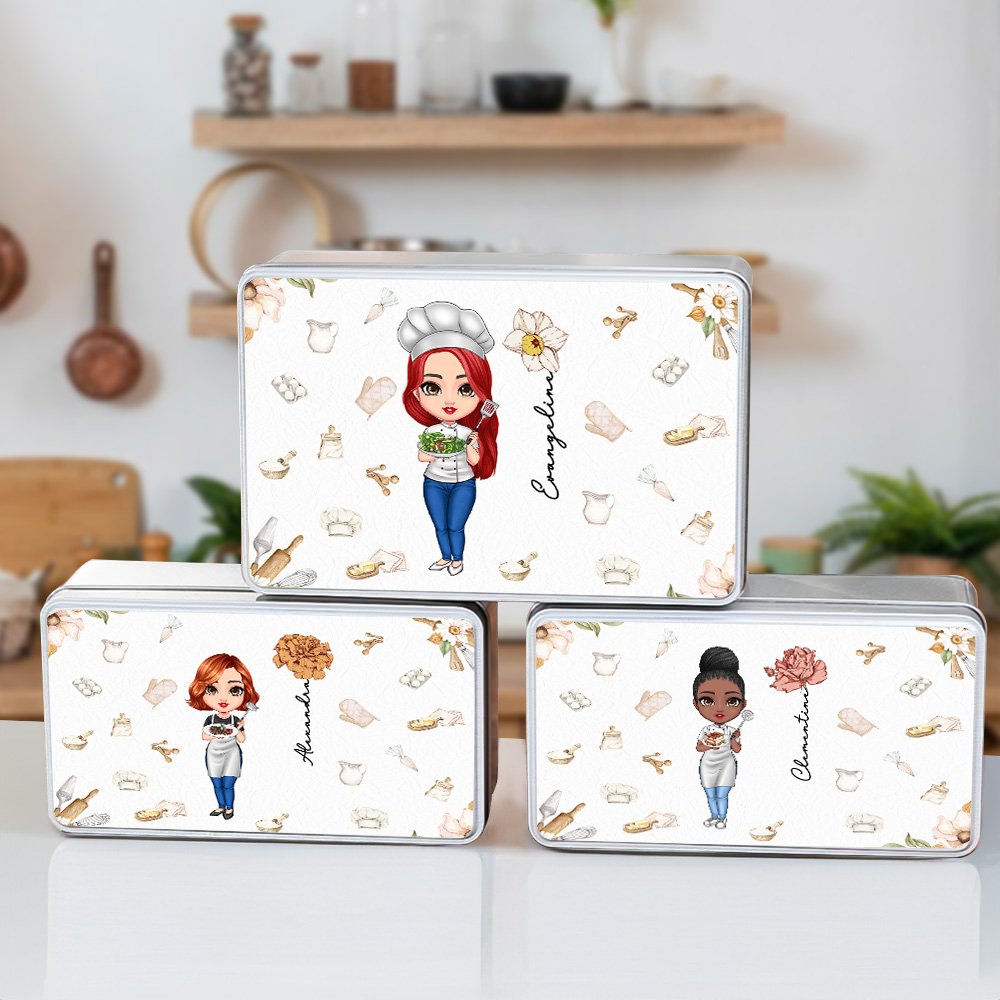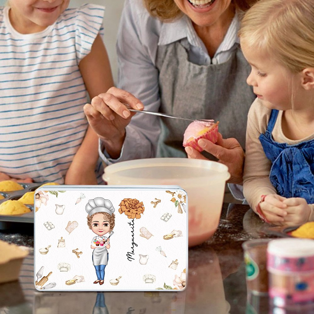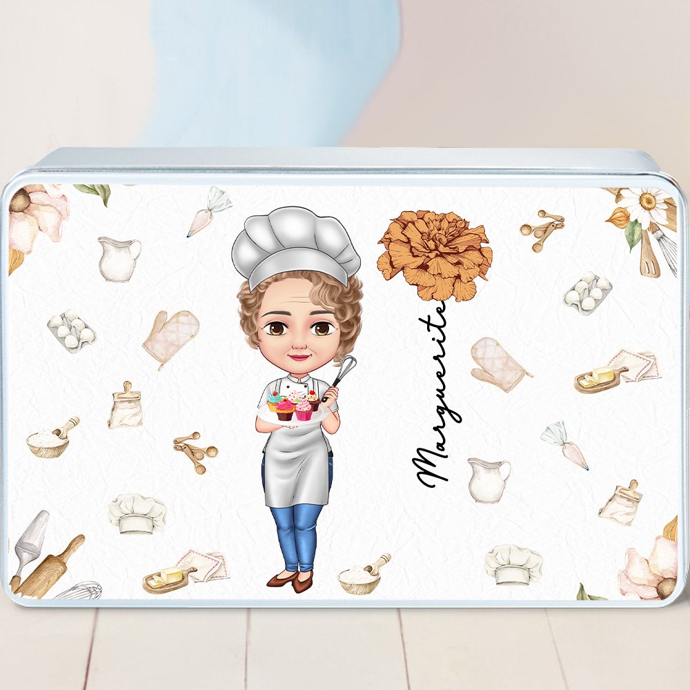 This biscuit box features a playful design with various cooking utensils like oven mitts, frying pans, chef’s hats, and wooden spoons, giving it a warm and interesting look. At the center is a stylish cartoon chef illustration, which can be personalized with your image. It can also be customized with your name and birth flower, making this biscuit box more unique.