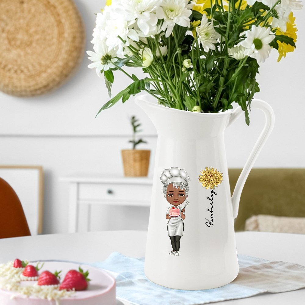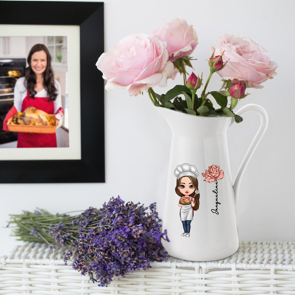 This vase features a charming cartoon chef illustration holding a dish and kitchen utensils. You can even customize it with your image, reflecting your personality. It can also be customized with your name and birth flower, making this vase more unique.