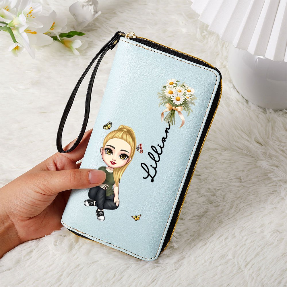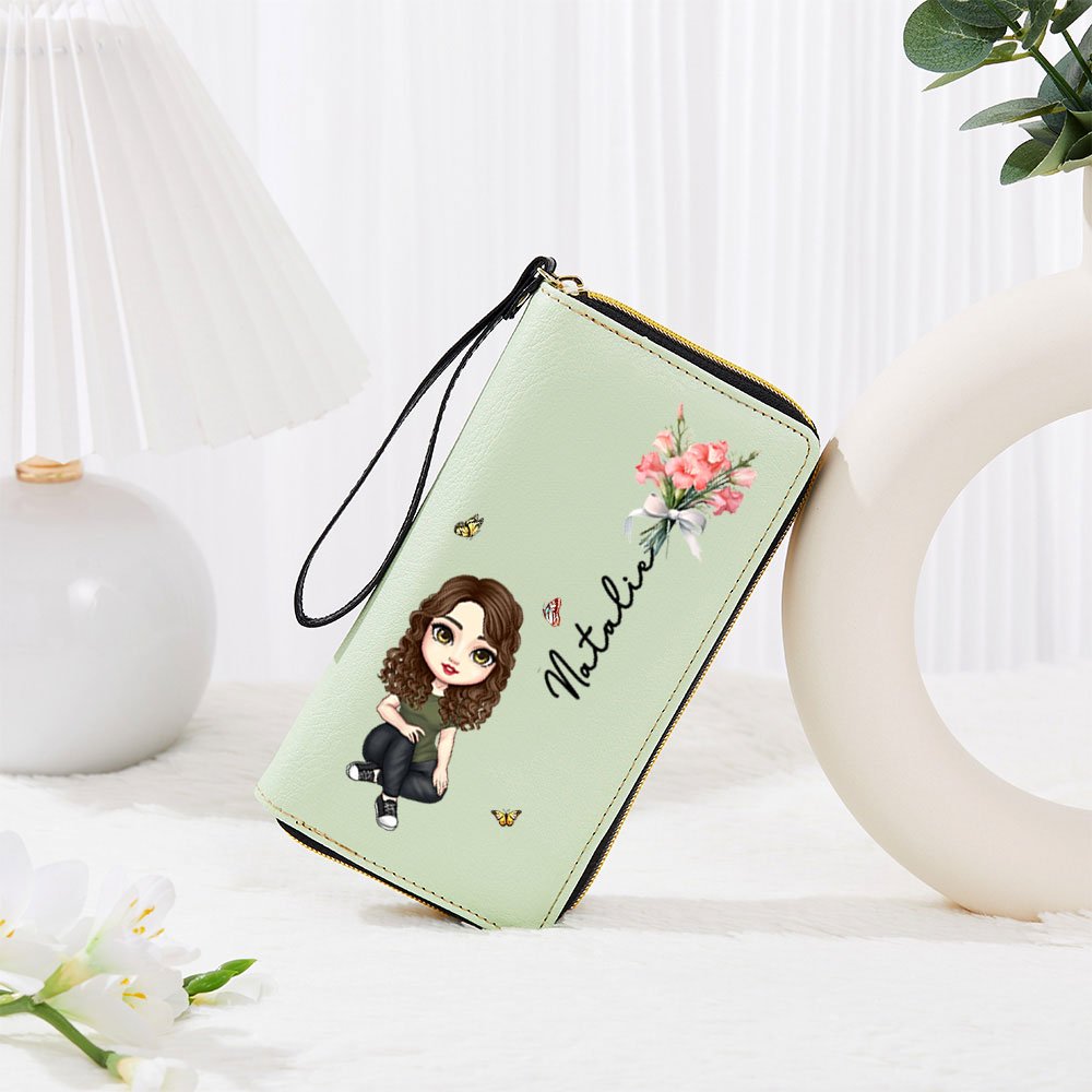 Celebrate individuality with this personalized wallet featuring a charming cartoon ladies' character design. Customize every detail, from hairstyle and eye color to outfit style, and pair it with a beautiful birth flower bouquet and your name for a unique accessory.
