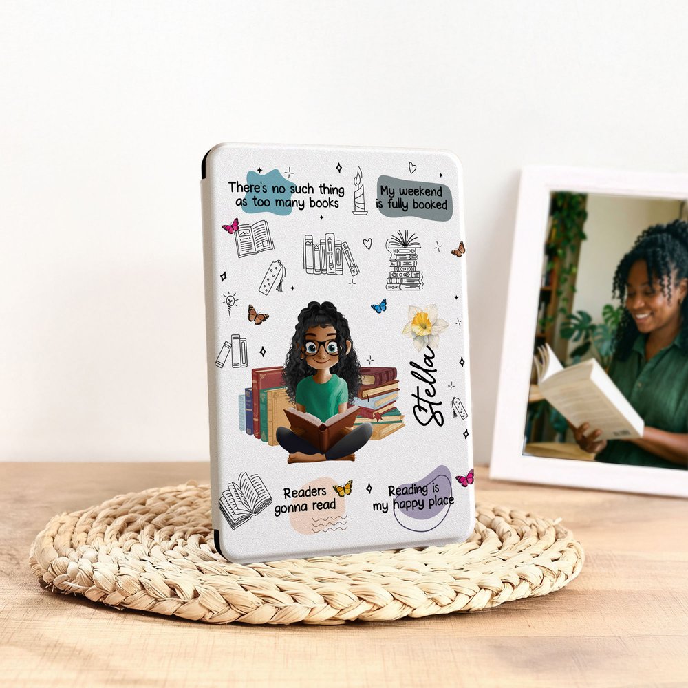 The front of the protective case features a custom cartoon image of a girl reading a book atop a stack. You can personalize it to match your own or the recipient's appearance (hairstyle, glasses, clothing). You can also customize birthday flowers and names, surrounded by witty and relatable literary quotes and doodles, protecting your e-reader in a fun and personalized way!